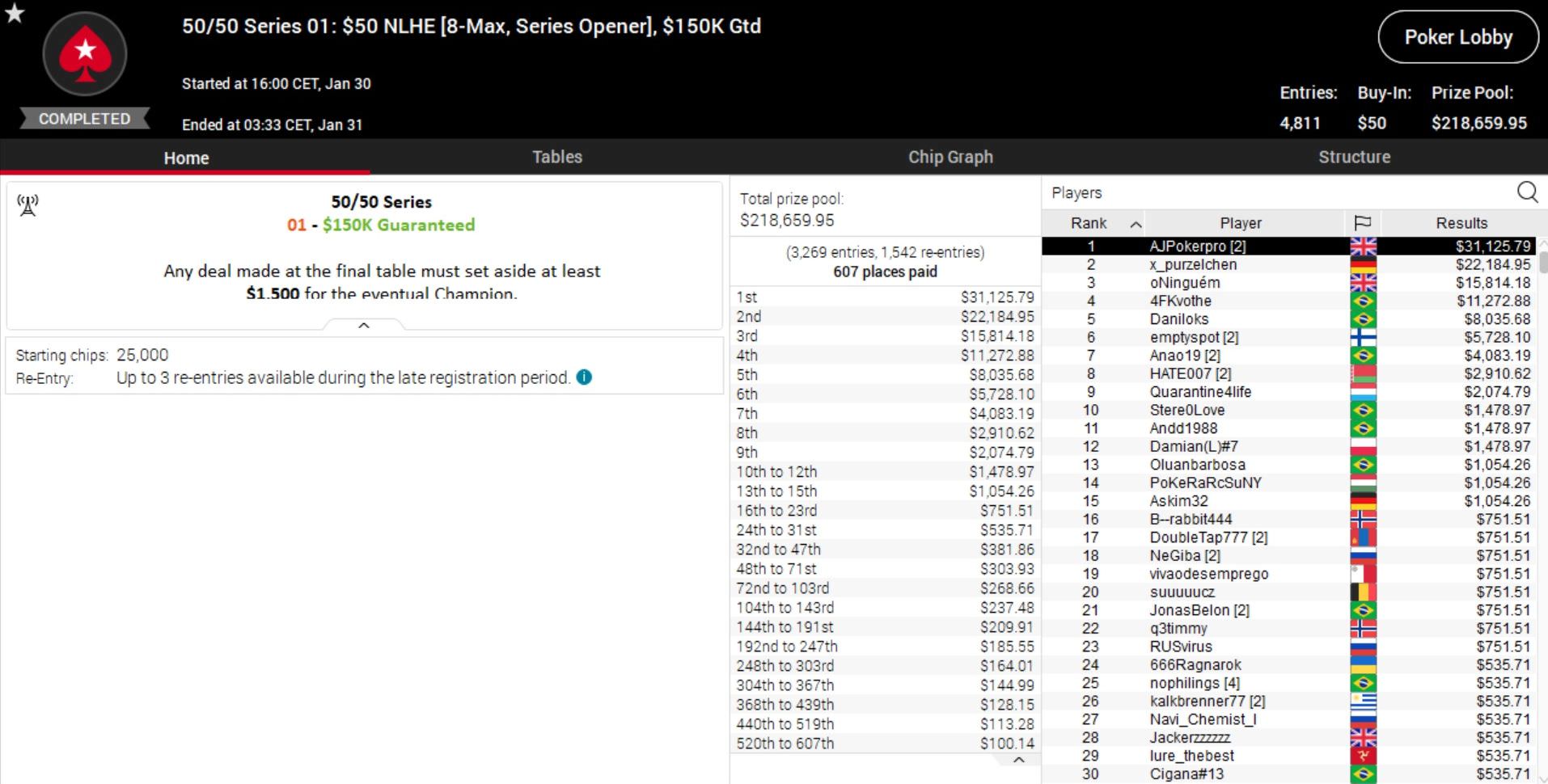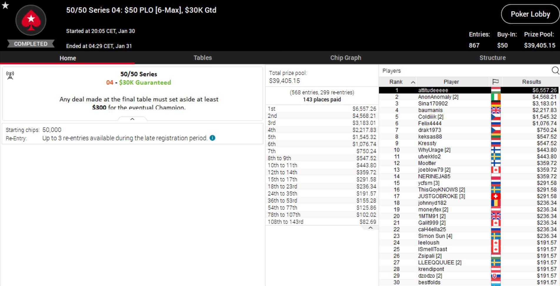 Zum Start der 50/50 Series holten die DACH-Spieler einige beeindruckende Resultate. Bei Event 1 landete „x_purzelchen“ auf Platz 2 und kassierte über $22.000, während „pudelpower“ aus Österreich sogar Erster bei Event 2 wurde und gut $20.000 mitnahm.