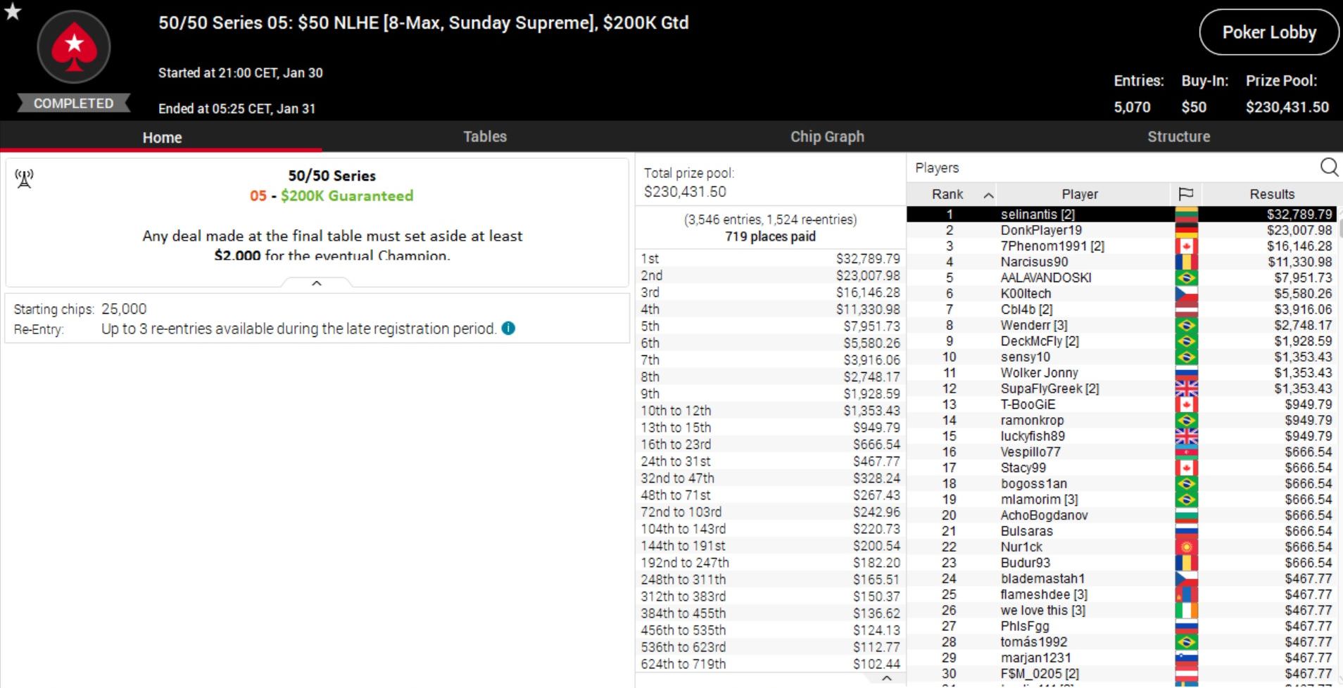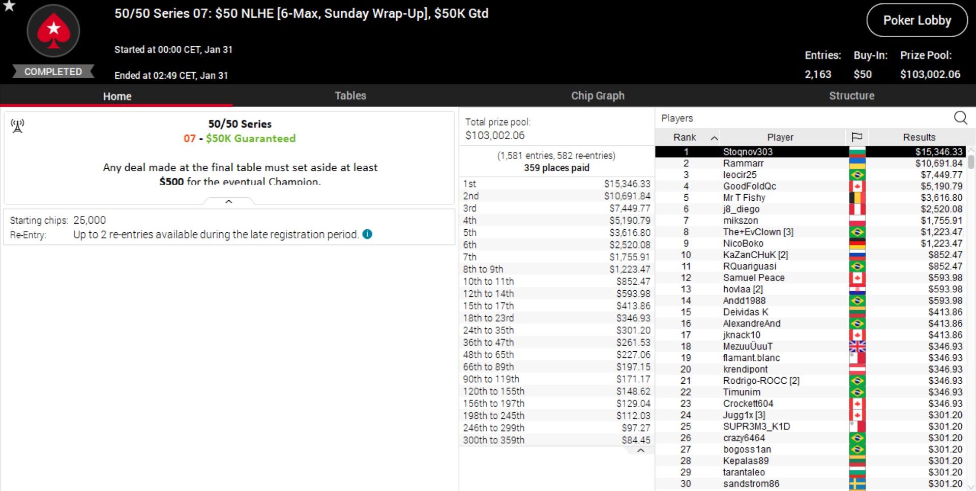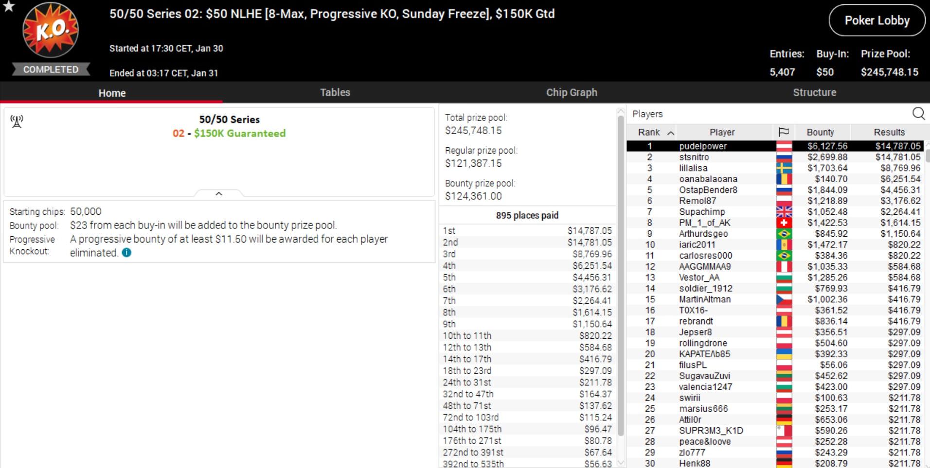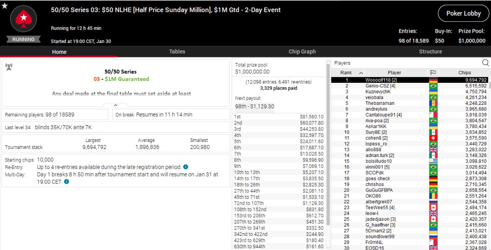 Da passt es ins Gesamtbild, dass auch bei der 50/50 Series Sunday Million ein Deutscher auf Platz 1 übernachtet.