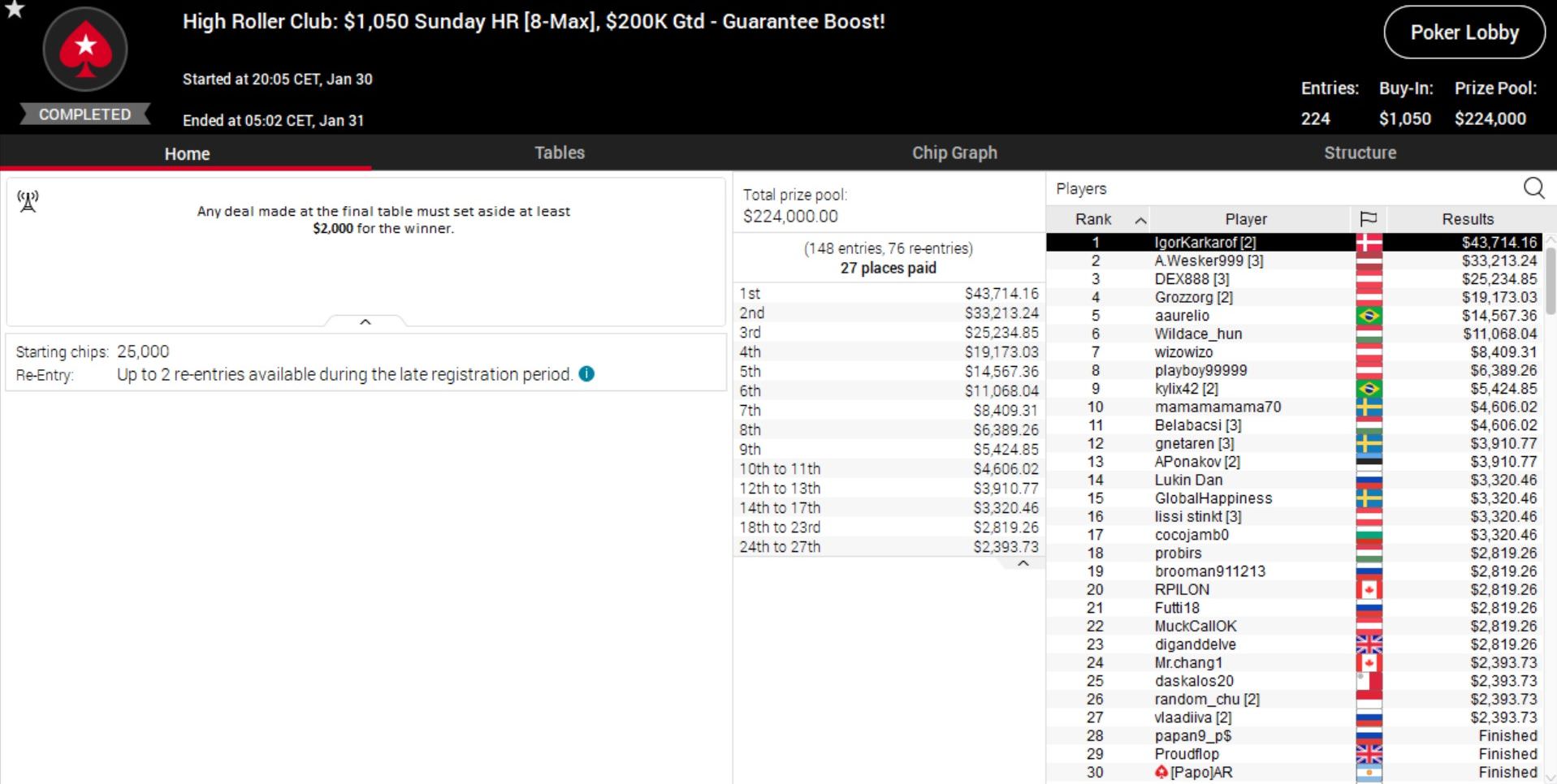 Gute Platzierungen gab es zudem beim $1.050 Sunday High Roller mit Marius „DEX888“ Gierse auf Platz 3 (rund $25.000) und „Grozzorg auf Platz 4 (rund $19.000) sowie beim $1.050 Supersonic, wo Maxi „mikki696“ Lehmanski und „Sintoras“ ebenfalls auf den Plätzen 3 und 4 landeten ($9.400 bzw. $6.200 Preisgeld.)