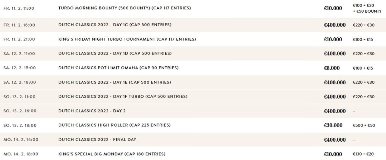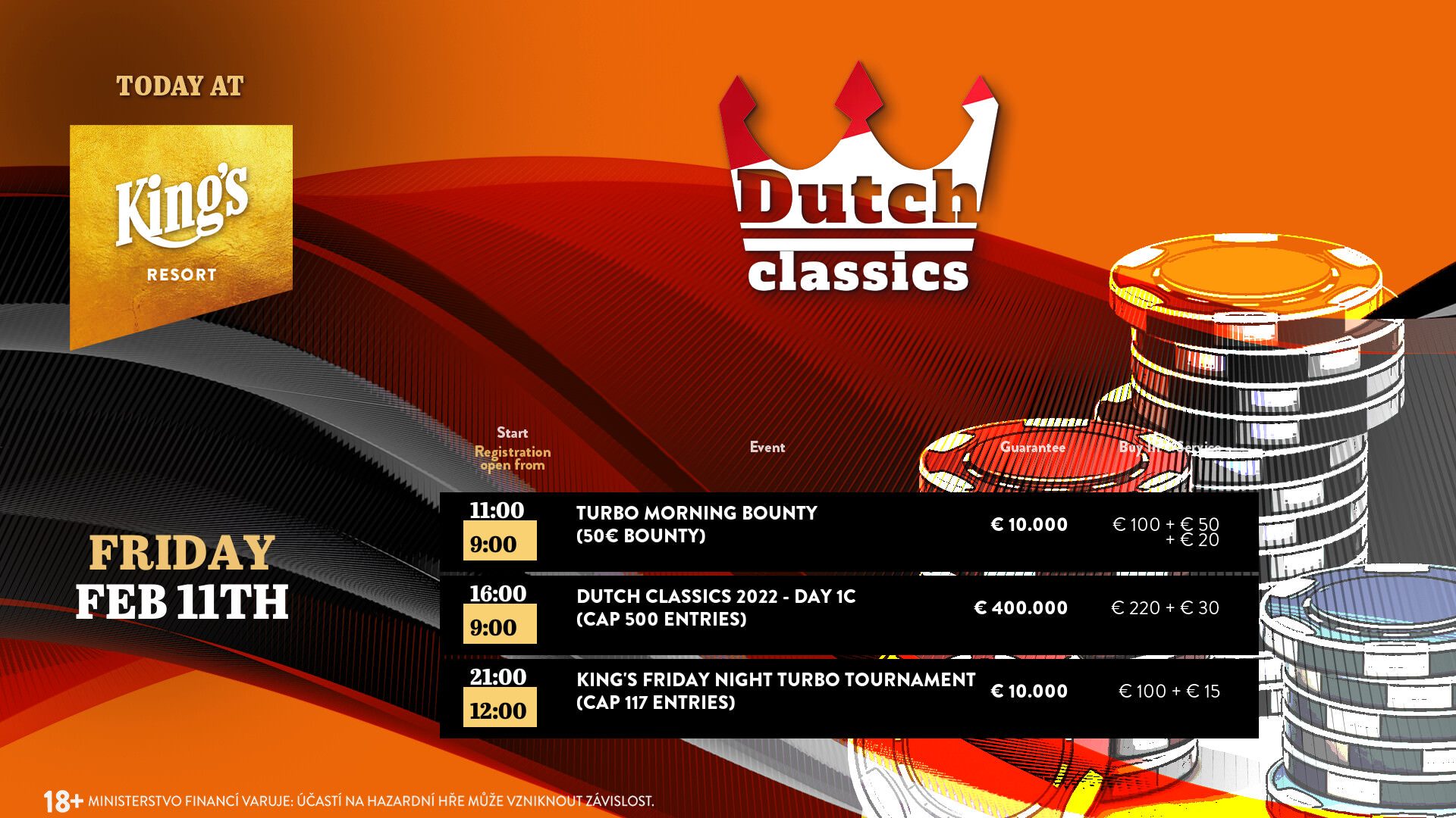 Heute steht im King’s Flight 1c beim €220+30 Dutch Classics Main Event im Blickpunkt. Vorher startet um 11 Uhr noch ein weiteres Turbo Morning Bounty mit €170 Buy-in (inkl. €50 Bounty) und am späten Abend wird ab 21 Uhr Uhr auch noch das €115 King’s Friday Night Turbo gespielt.