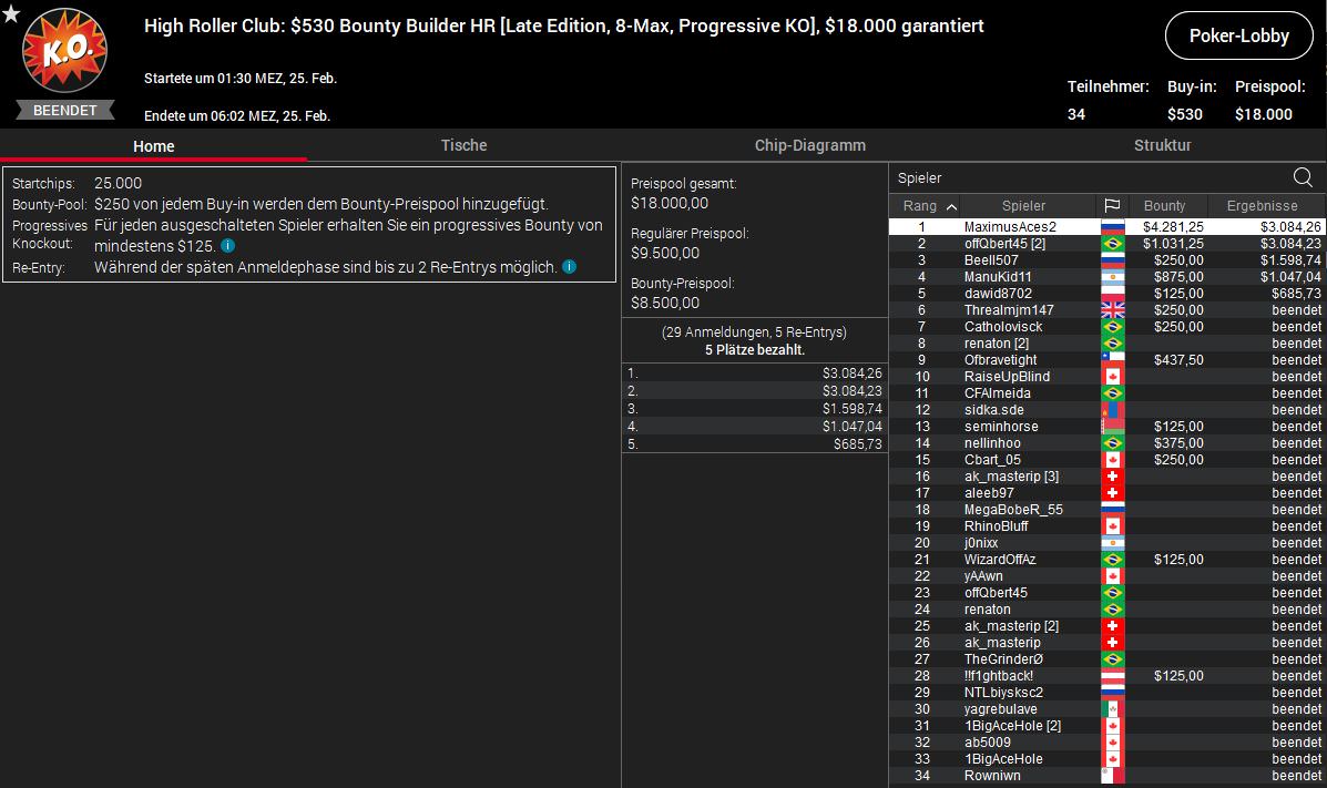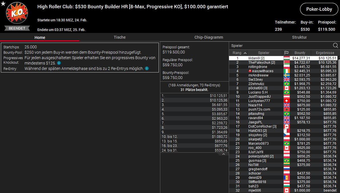 Ansonsten lief nicht viel zusammen. Beim $530 Bounty Builder HR schieden JustTrappedU ($1.080/$562) aus Österreich und Luckyelen777 ($1.080/$750) aus der Schweiz auf den Plätzen zehn und elf aus. Den Sieg für $10.125 plus $14.277 schnappte sich der Ungar lildani9. Fintan easywithaces Hand ($5.095/$2.445) vom Team PokerStars belegte Platz vier.