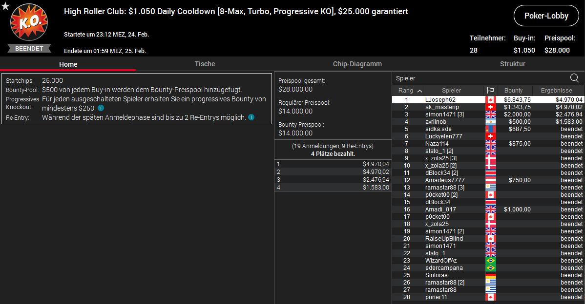 Das Top-Ergebnis lieferte der Schweizer ak_masterip mit Platz zwei beim $1.050 Daily Cooldown, der ihm neben $1.343 an Bounties auch $4.970 Preisgeld einbrachte.