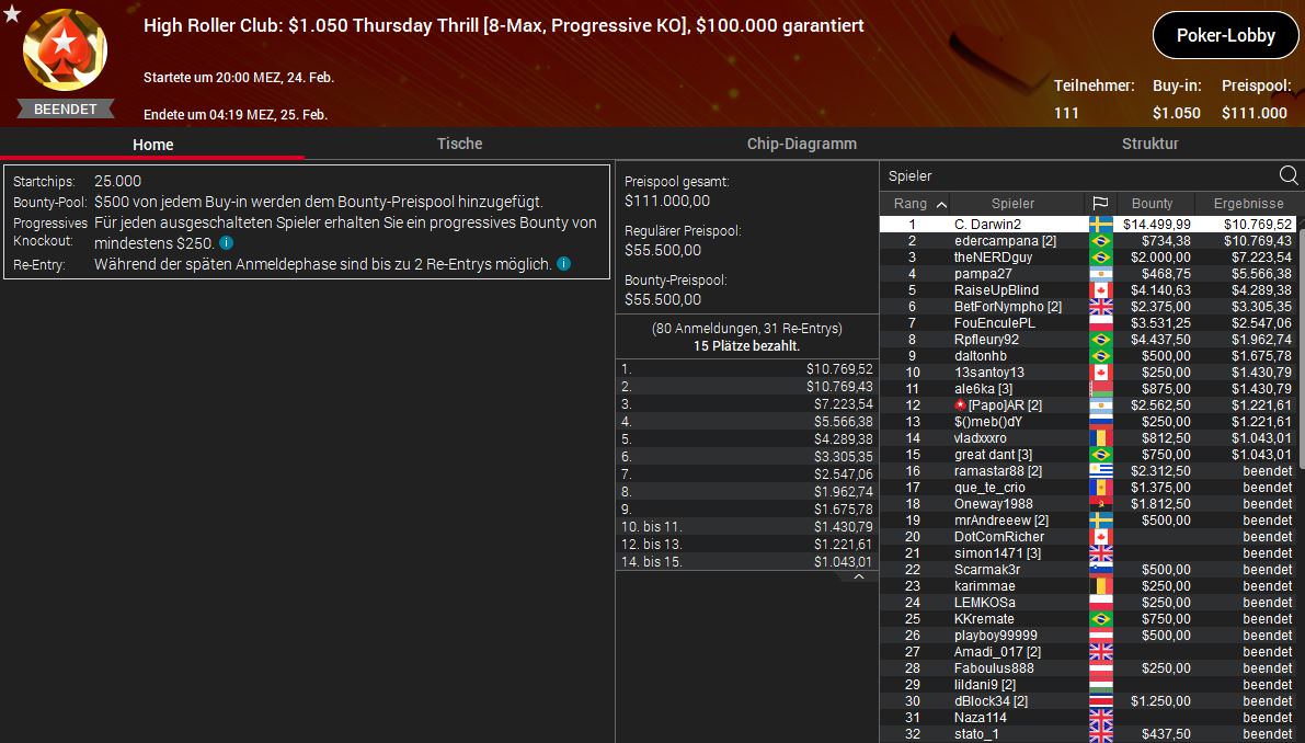 Das $1.050 Thursday Thrill gewann der Schwede Simon C. Darwin2 Mattsson für $10.769 plus $14.499. Von den deutschsprachigen Teilnehmern schafft kein einziger den Sprung in die bezahlten 15 Plätze.
