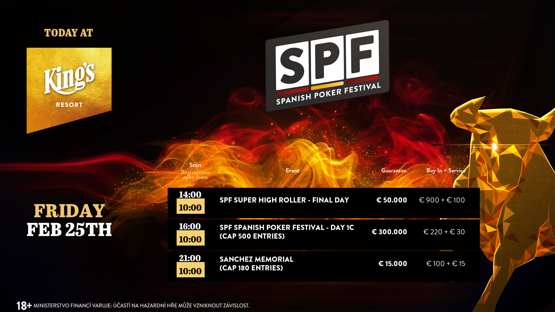 Die Side Events beim Spanish Poker Festival im King’s Resort Rozvadov sind allesamt gut besucht, so auch das Ein-Tages-Turnier €50+10 (€25 Bounty) KO Accumulator und der auf zwei Spieltage angesetzte €900+100 Super High Roller Event.