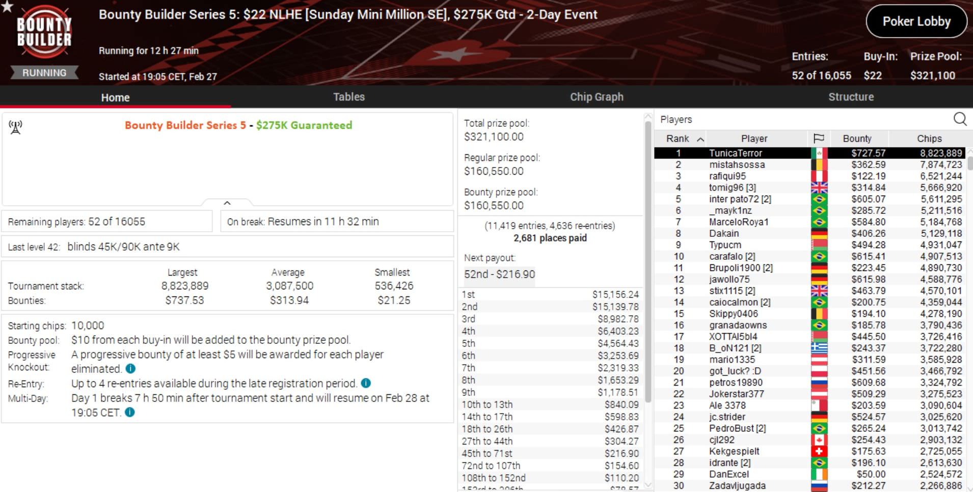 Insgesamt 14 Turniere mit Buy-Ins von $22 bis $5.200, darunter auch die Sunday Million und das Titans Event wurden in das Programm der Bounty Builder Series integriert.