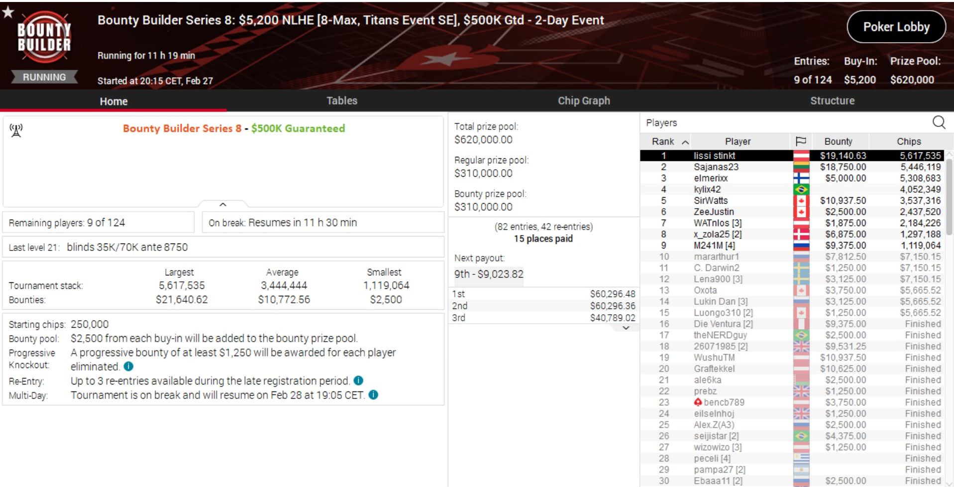 Außerdem steht er im Finale des $5.200 Titans Event und hat damit schon gut $9.000 sicher. Als Siebter muss er sich allerdings strecken, während Christopher „lissi stinkt“ Frank als Führender ins heutige Finale geht und beste Chancen auf die Siegprämie von $60.000 hat.
