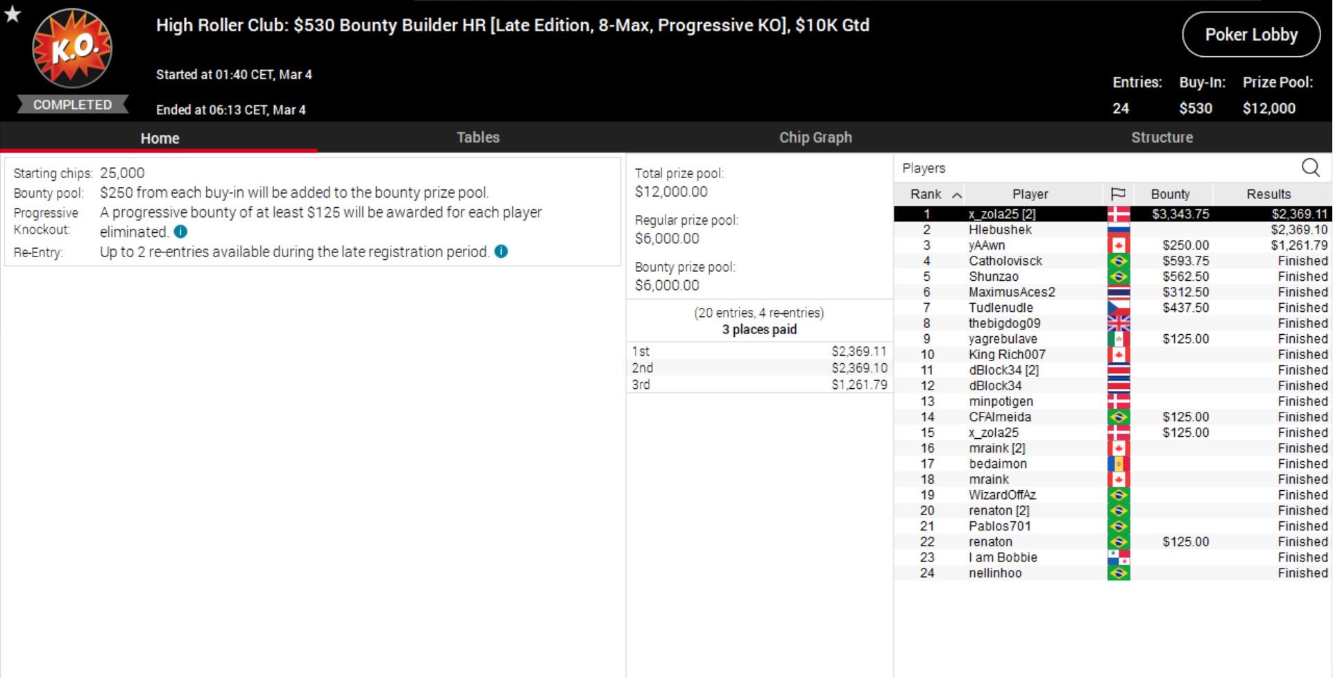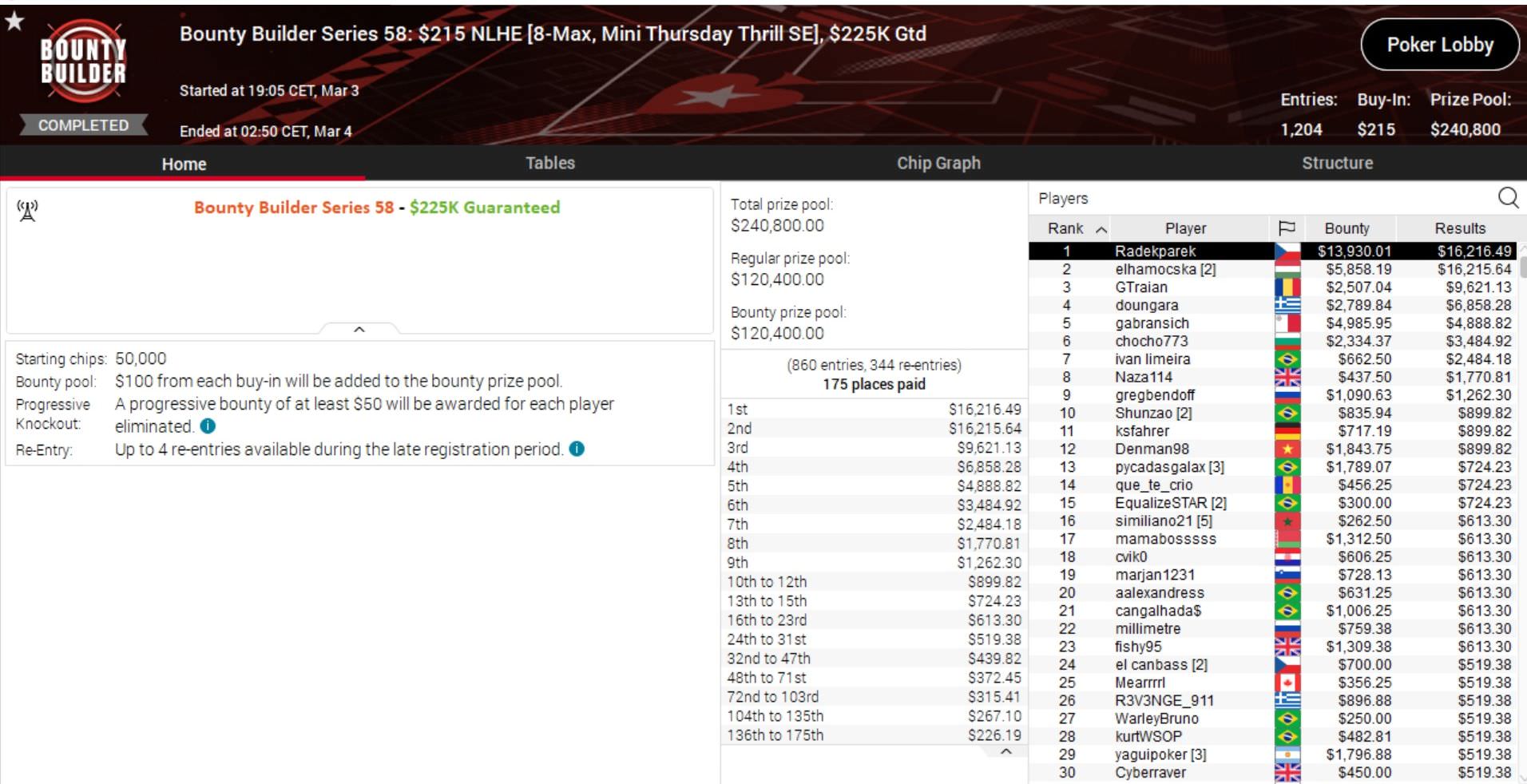 Am Donnerstag wurden auf PokerStars die nächsten Turniere der Bounty Builder Series und vier Events im High Roller Club ausgetragen.