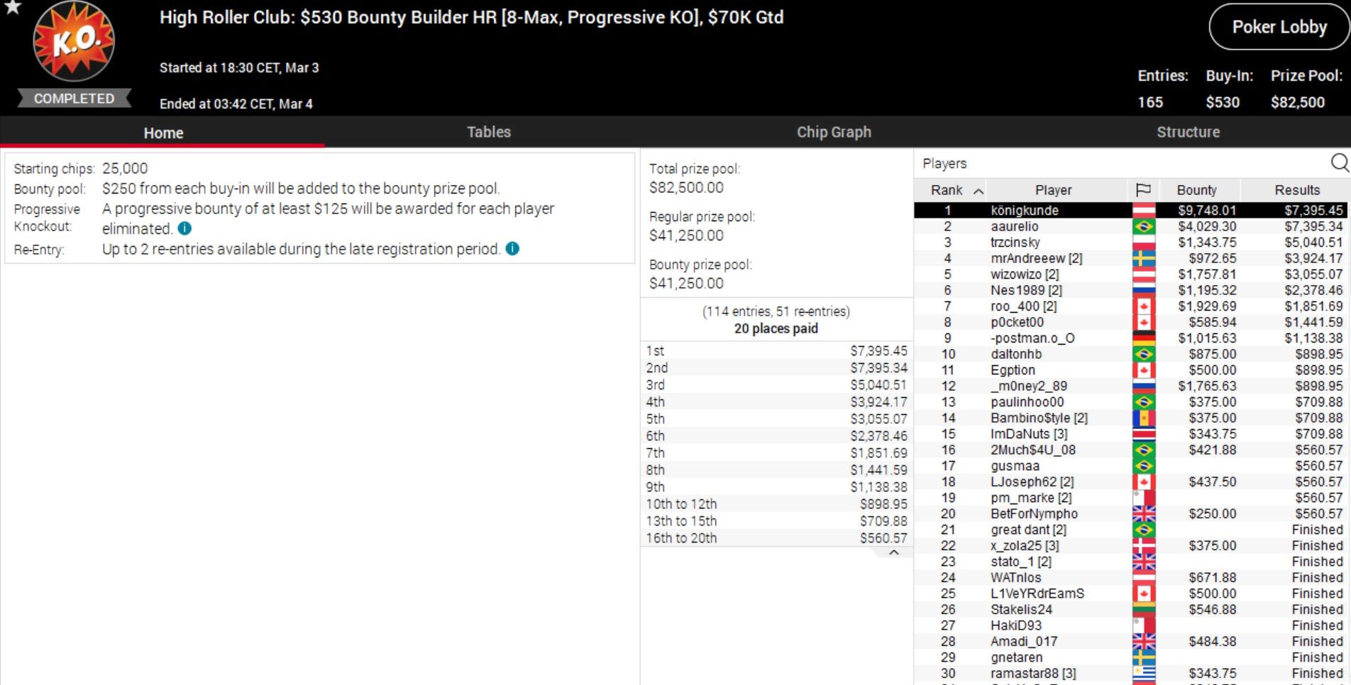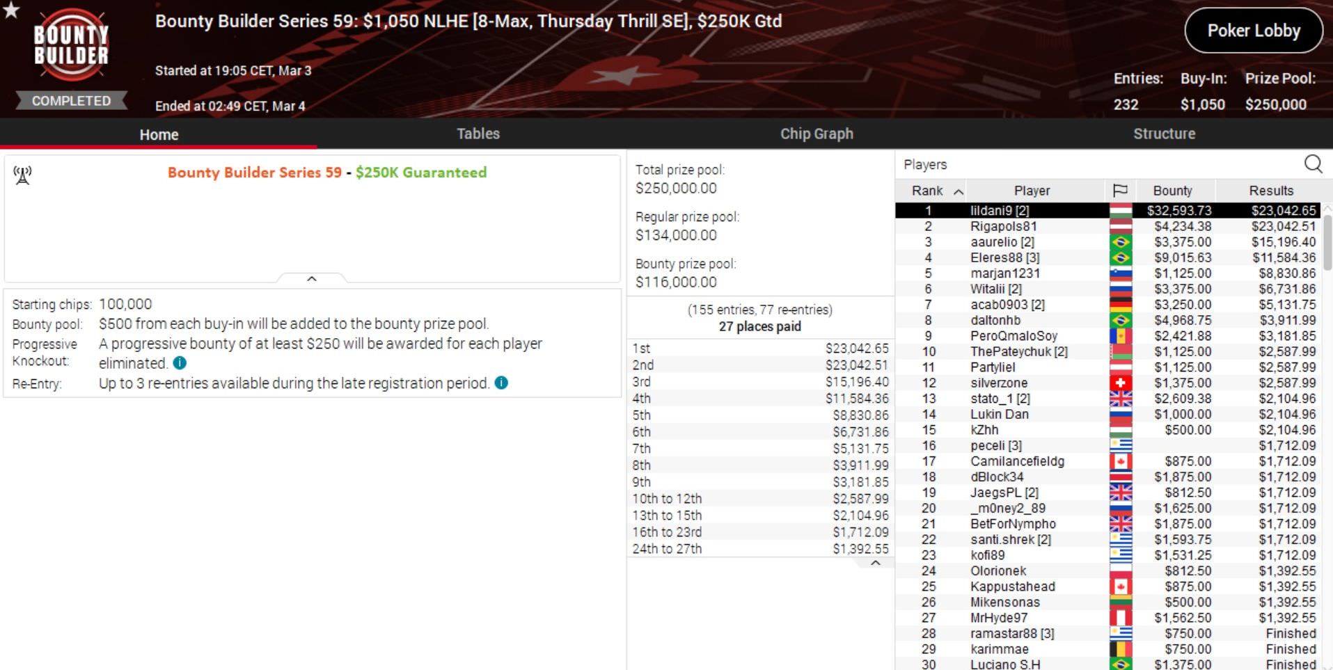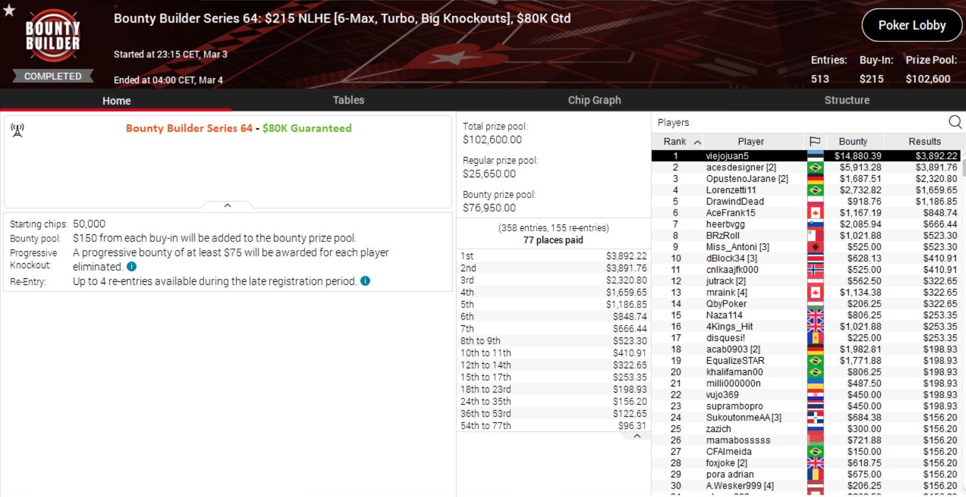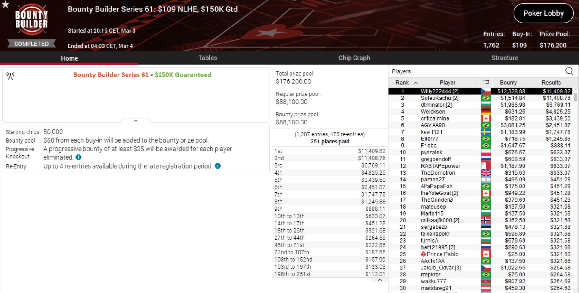 Bei der Bounty Builder Series blieben die deutschsprachigen Spieler gestern sieglos. Das beste Ergebnis holte „OpustenoJarane“ mit Platz 3 bei Event 64, einem $215 NLH-KO-Turnier. Als Belohnung gab es gut $4.000 Preisgeld.