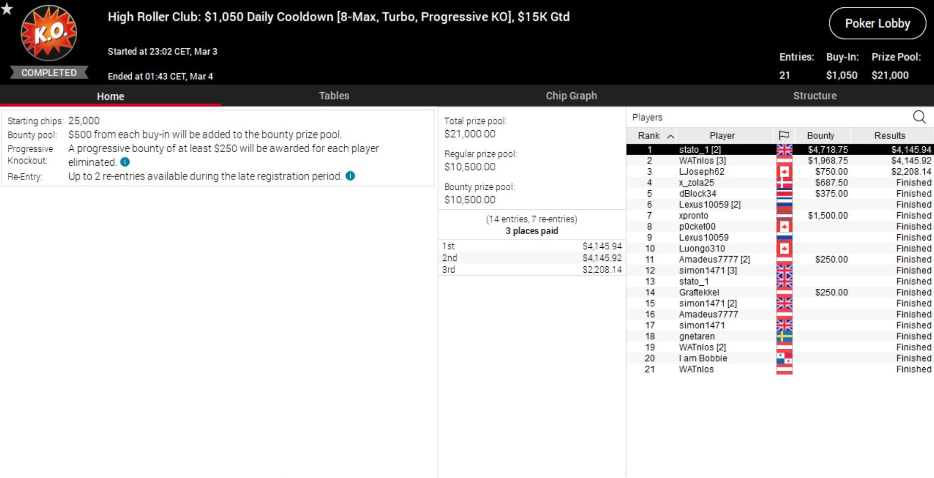 Knapp am Sieg vorbei schrammte dagegen Christian „WATnlos“ Rudolph beim $1.050 Cooldown. Er produzierte drei der 21 Entrys, wurde am Ende Zweiter und kassierte gut $6.000 Preisgeld.