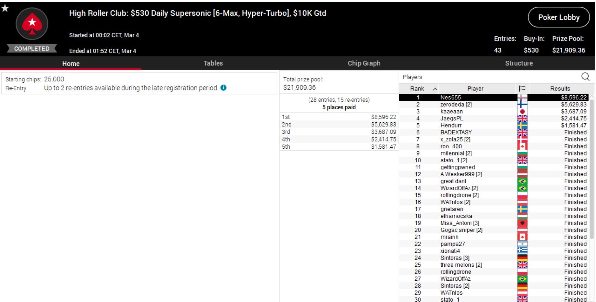 Das Treppchen haarscharf verpasst hatte zuvor „Weicksen“ aus Deutschland, der als Vierter von Event 61, einem $109 NLH, rund $5.500 gewann.