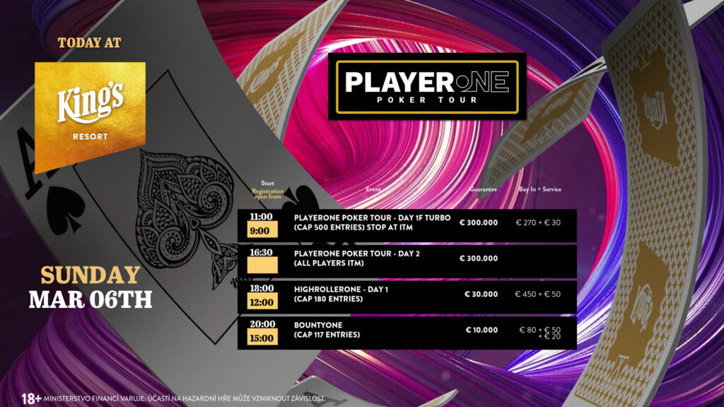 Im King’s sind vor allem am Wochenende ruhige Spieltage unüblich. Wahrscheinlich wird die European Poker Tour im King’s Prag die Spieler in die tschechische Hauptstadt führen. Am heutigen Sonntag müssen nochmal knapp 225 Spieler in die Player One Poker Tour einsteigen, damit die Garantiesumme geknackt werden kann.
