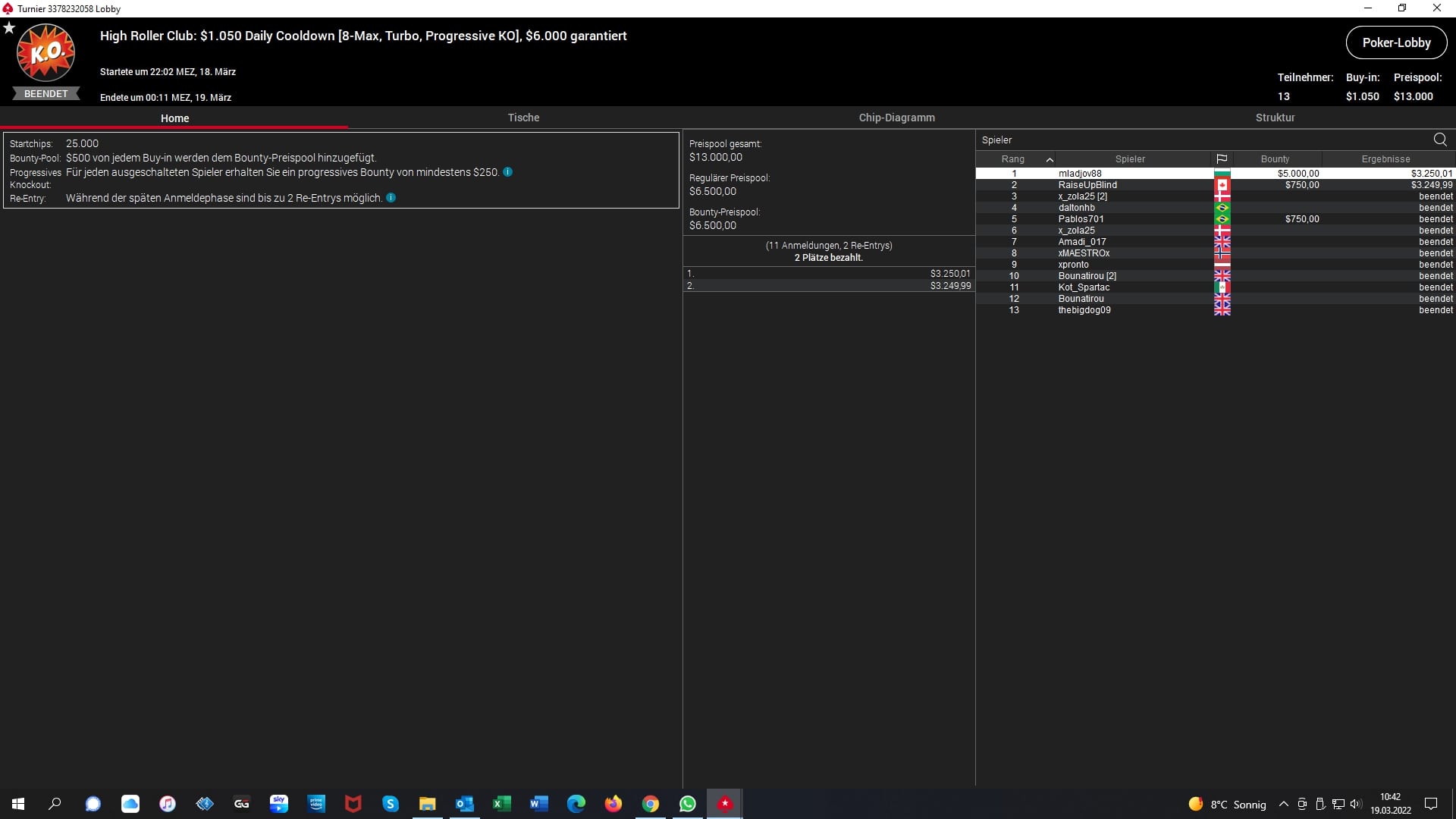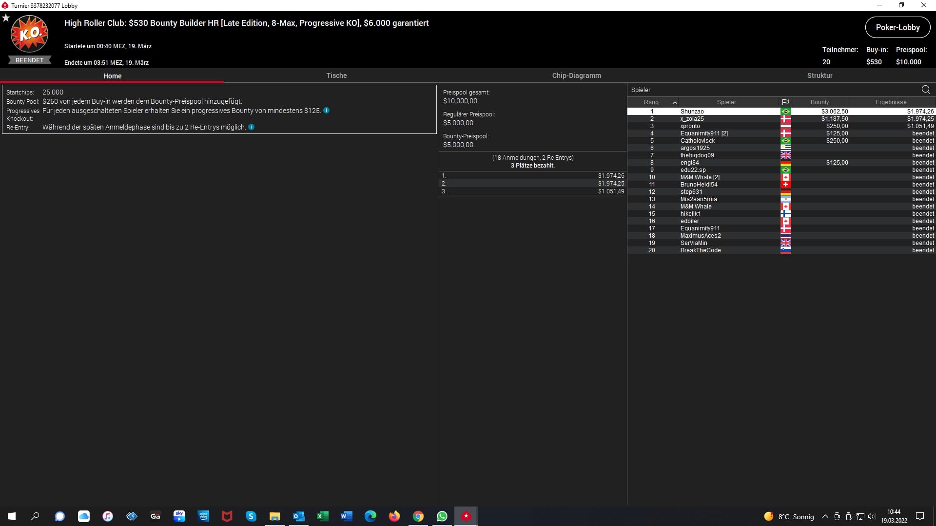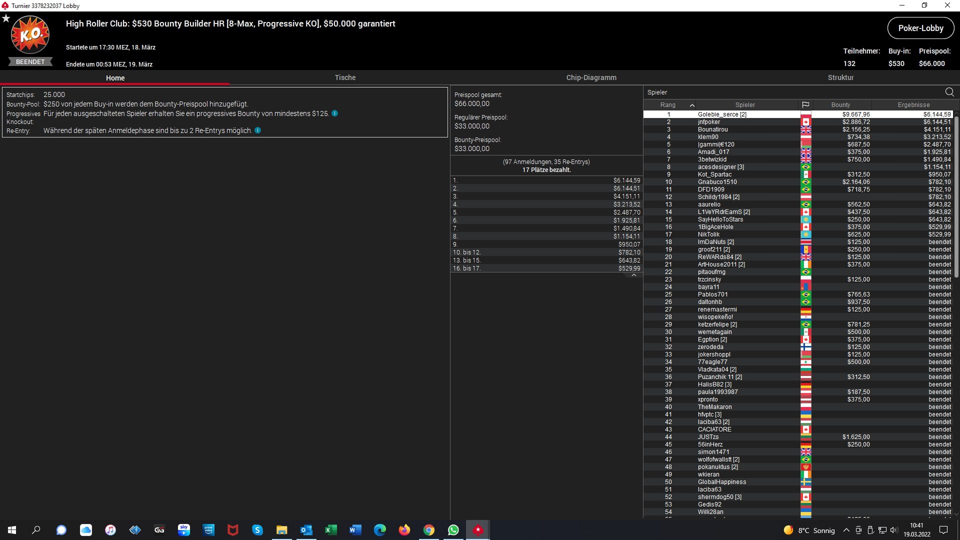 Die Poker-Action im High Roller Club am Freitag war recht verhalten. Beim $530 Bounty Builder High Roller kamen aber immerhin 132 Entries zusammen und ein Preisgeld von $66.000 wurde ausgespielt. Der Österreicher „klem90“ schaffte es bis auf Rang 4 für $3.213 + $734 Bounties. Dominik „Bounatirou“ Nitsche (GER/GBR) schaffte es als bester DACH-Spieler auf Platz 3 und cashte $4.151 + $2.156 Bounties. Den Sieg und $6.144 + $9.667 Bounties schnappte sich der Pole „Galebie_serce“.