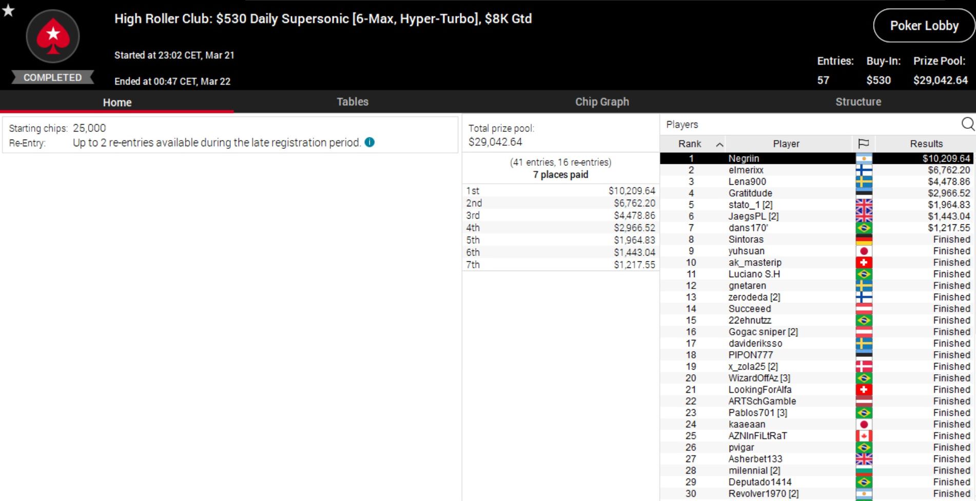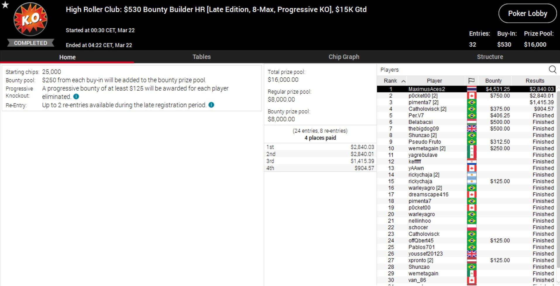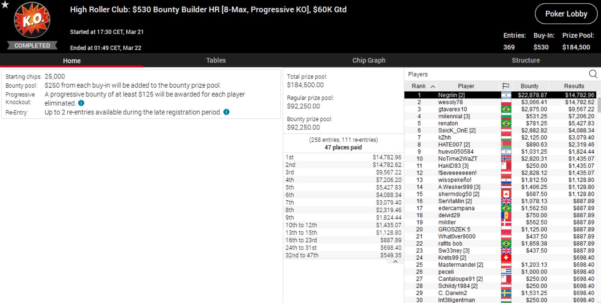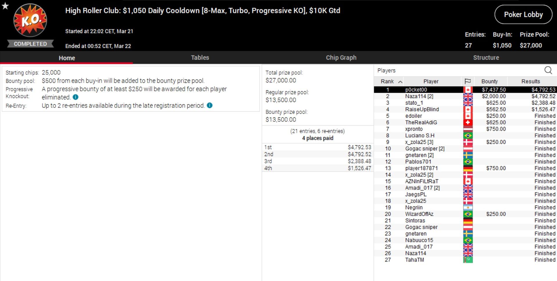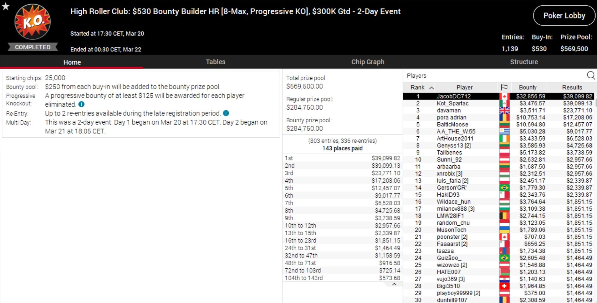 Entschieden wurden gestern zudem einige Turniere im High Roller Club, darunter auch das $5.200 Titans Event und der $530 Bounty Builder vom Sonntag.