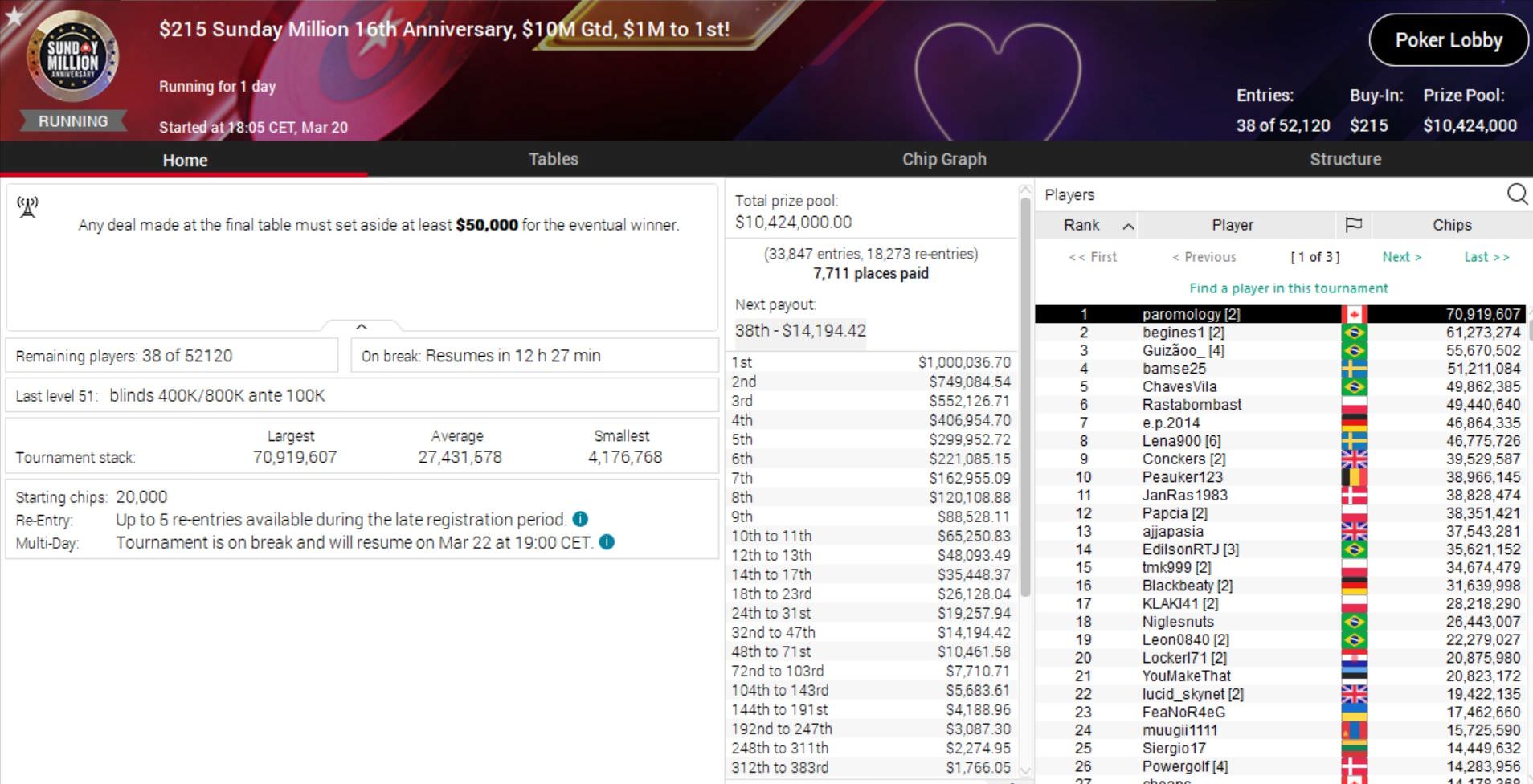 Es hat gereicht. Am Montag kauften sich bei der Jubiläumsausgabe der Sunday Million auf PokerStars noch einmal 3.996 Spieler ein und sorgten so dafür, dass die Garantie von $10 Millionen geknackt wurde.