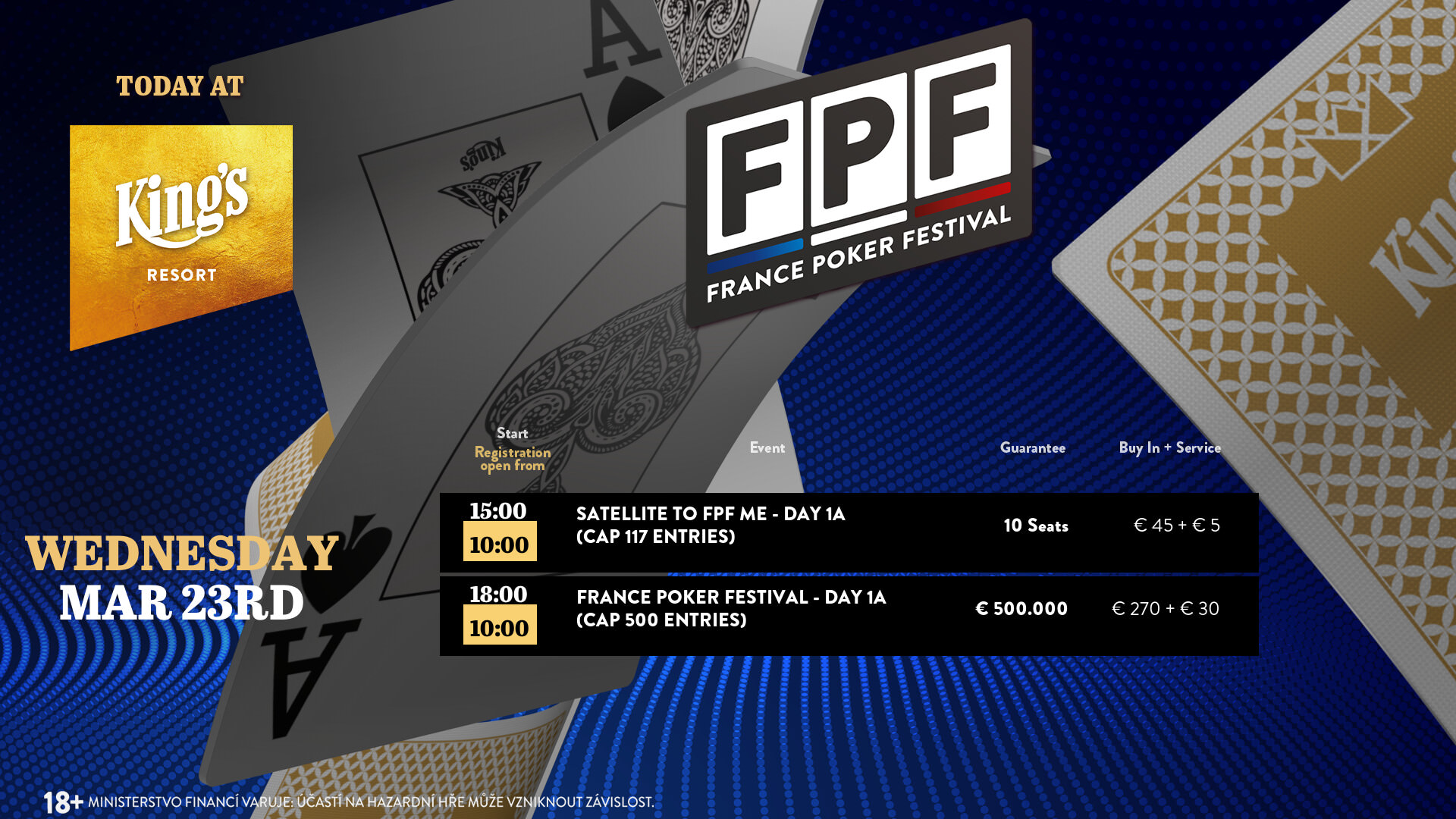 Heute geht es um 18 Uhr weiter mit dem ersten von sieben Starttagen beim €270+300 FPF Main Event für den ein Preispool in Höhe von €500.000 garantiert wird. Die Spieler beginnen das Turnier mit 50.000 Chips bei 40-minütigen Level. Am zweiten Spieltag werden dann 50 Minuten pro Blindstufe gespielt und am Finaltag sogar 60 Minuten.