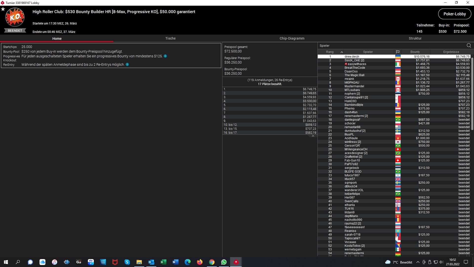 Beim $530 Bounty Builder High Roller bauten 145 Entries einen Preispool von $72.500 auf. Im Heads-Up konnte sich der Ukrainer „drew.dersh“ gegen Class „SsicK_OnE“ Segebrecht (GER/AUT – $6.749 + $1.757 Bounties) durchsetzen und das Turnier für $6.749 + $10.576 Bounties gewinnen.