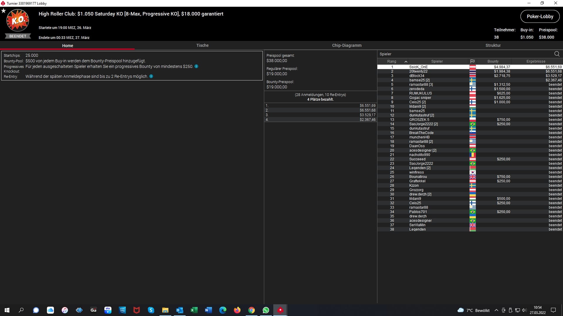 Anschließend lief es für Class beim $1.050 Saturday KO Event noch besser. Er konnte sich gegen 37 Gegner durchsetzen und den Sieg sowie $6.551 + $4.984 Bounties abräumen.