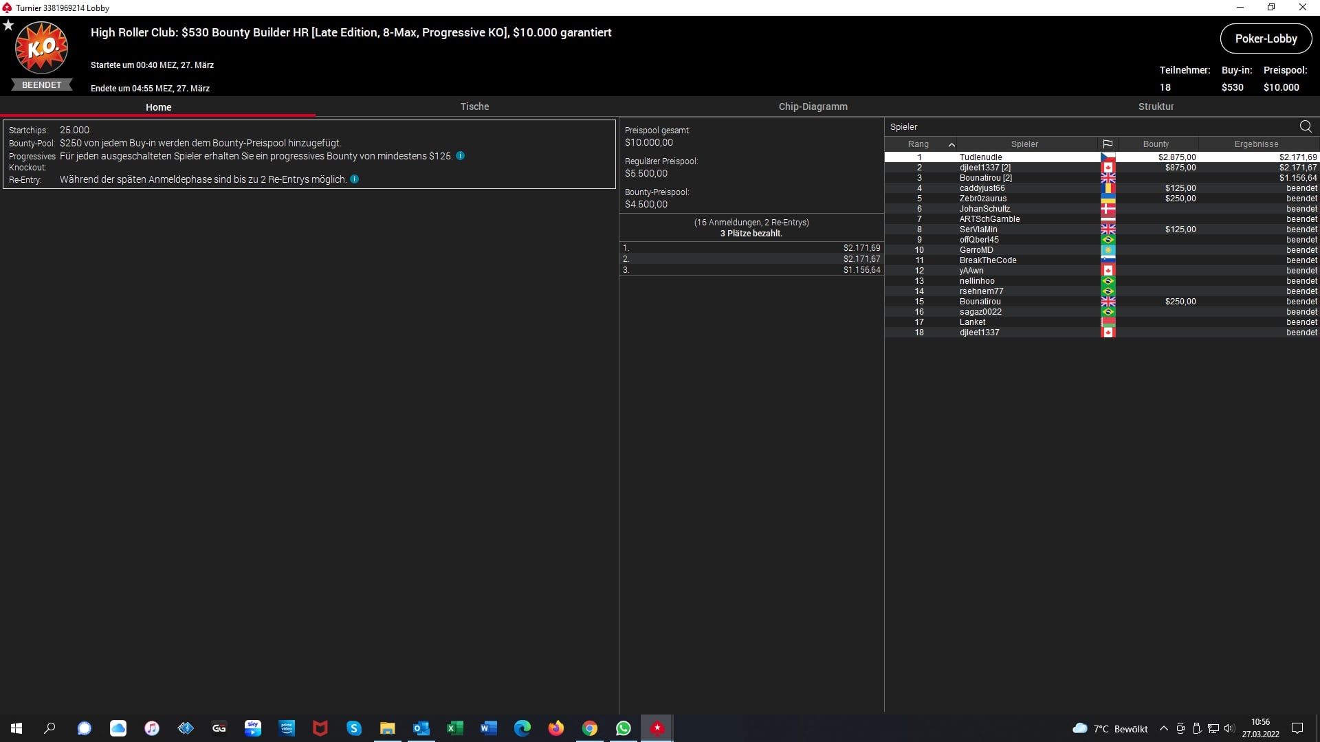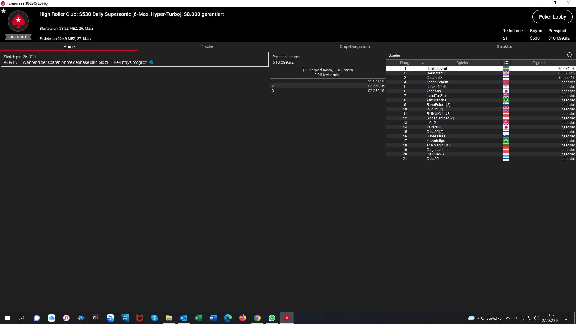 Auch für Dominik „Bounatirou“ Nitsche (GER/GBR) gab es zwei Podiumsplätze am Samstag. Erst wurde er Runner-Up für $3.378 beim $530 Daily Supersonic und wenig später belegte er noch Platz 3 für $1.156 beim $530 Bounty Builder High Roller Late-Edition Event.