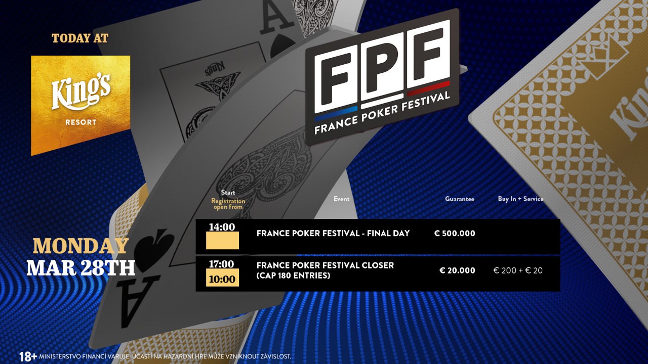 Heute gibt es neben dem Finale des Main Event auch noch den €200+20 Closer des France Poker Festival. Los geht es um 17 Uhr, maximal 180 Spieler können teilnehmen.