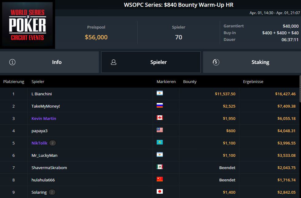 Auffällig wurde auch der Argentinier L Bianchi, denn ihm gelang ein Doppelschlag. Nachdem er zunächst das $840 Bounty Warm-Up HR und $16.427,46 gewonnen hatte, legte er 20 Minuten später den Sieg beim $888 CRAZY EIGHTS HR für $11.751,19 nach.