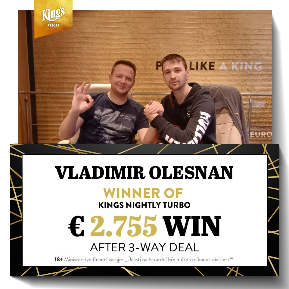 Außerdem wurde am Montag mit dem €130+20 King’s Night Turbo Tournament noch ein Side Event gespielt. Bei 117 Entries wurden die maximal möglichen €14.449 an Preisgeldern ausgespielt und es gab einen Deal der letzten drei Spieler. Als offizieller Gewinner kassierte der Slowake Vladimir Olesnan €2.755, der Österreicher Roland Mader und der Franzose Tristan Berrod bekam je €2.754 ausbezahlt.