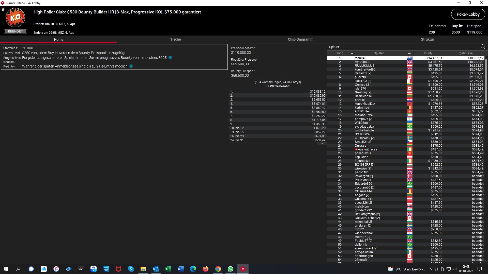 Das $530 Bounty Builder High Roller gewann am Dienstag „than048“ aus Neuseeland für $10.083 + $14.457 Bounties. Leon „RUMUKULUS“ Sturm (GER/AUT) belegte hier Platz 3 für $6.653 + $5.175 Bounties.