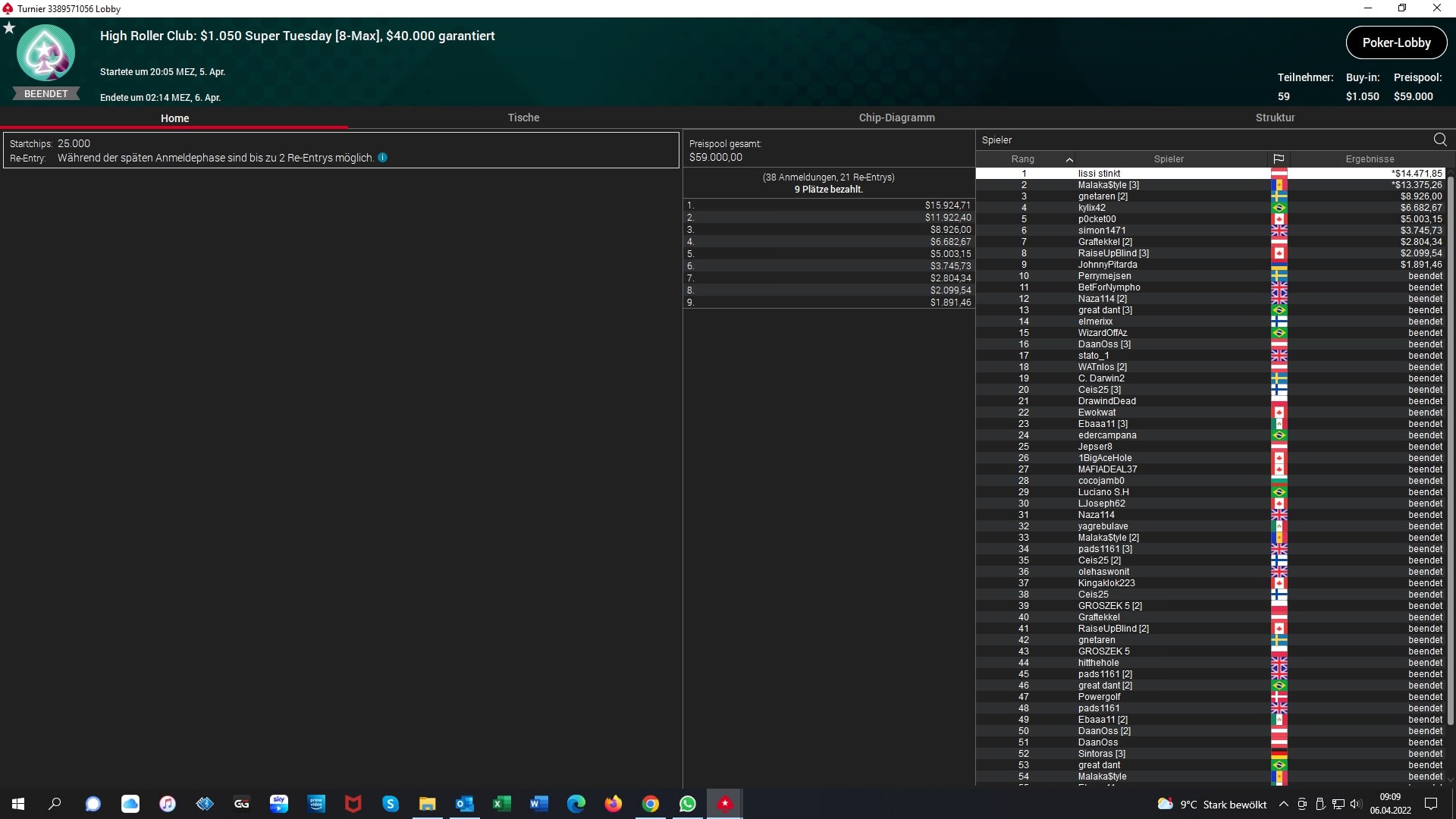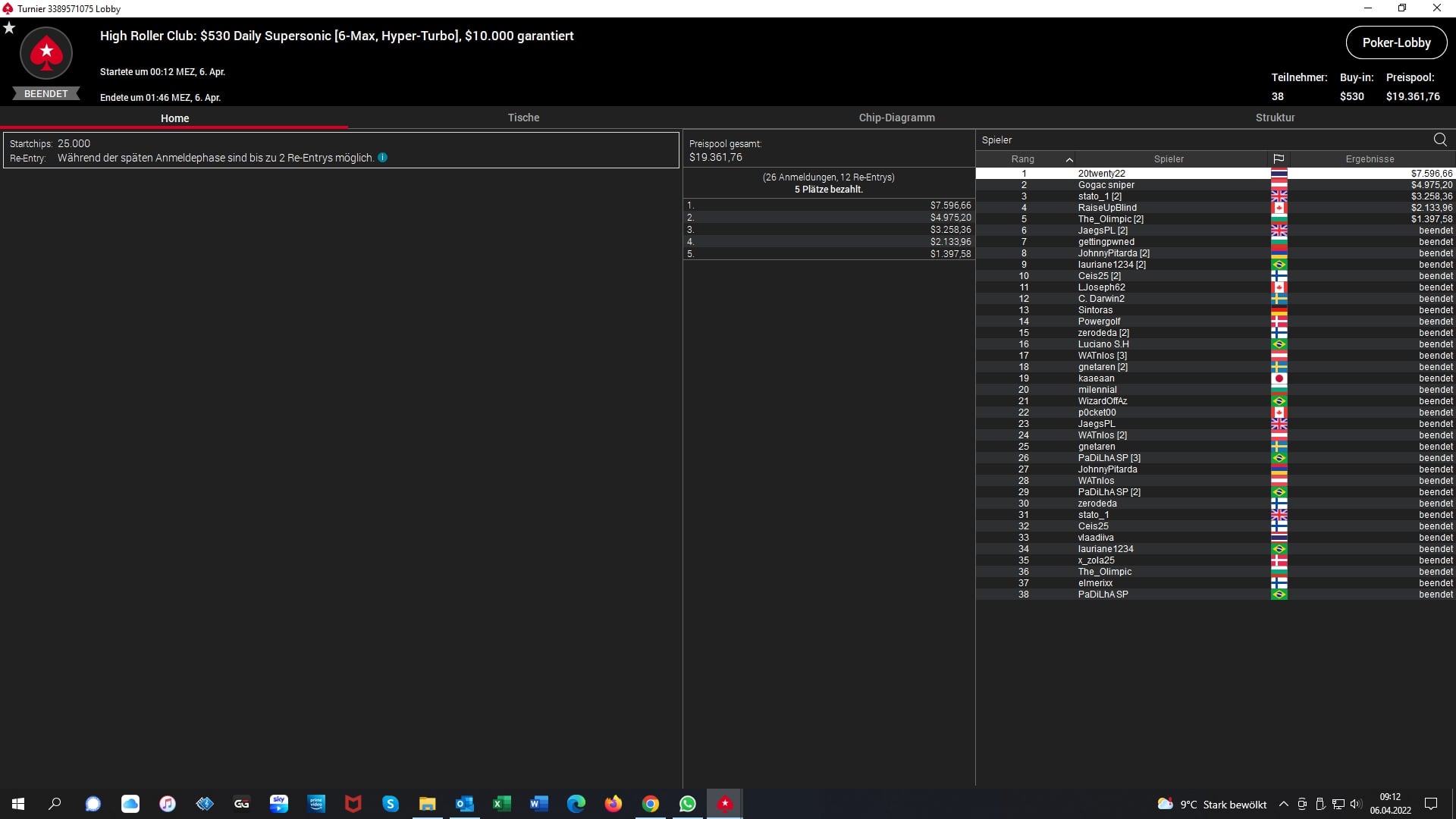 Silber und $4.975 gab es für „Gogac sniper“ (AUT) beim $530 Daily Supersonic. Den Sieg schnappte sich hier „20twenty22“ aus Thailand für $7.596.