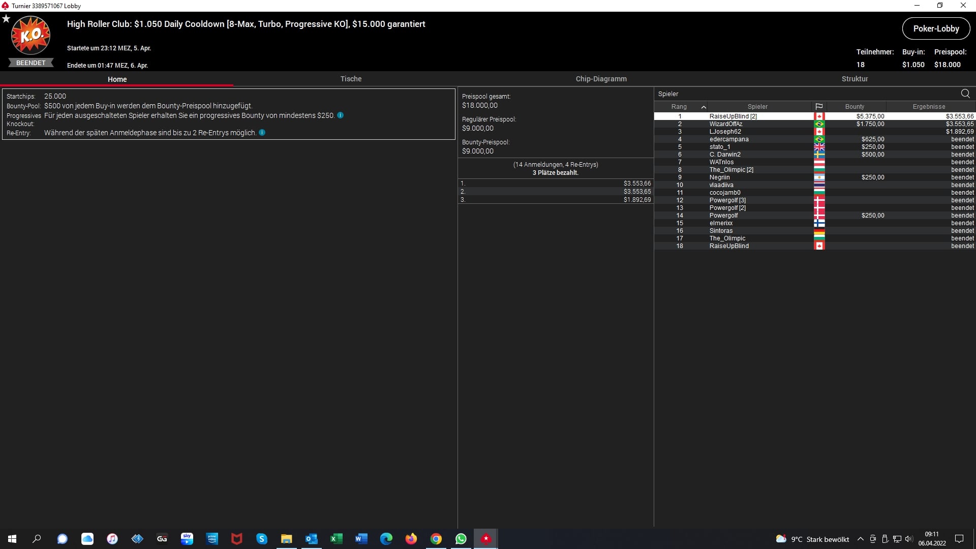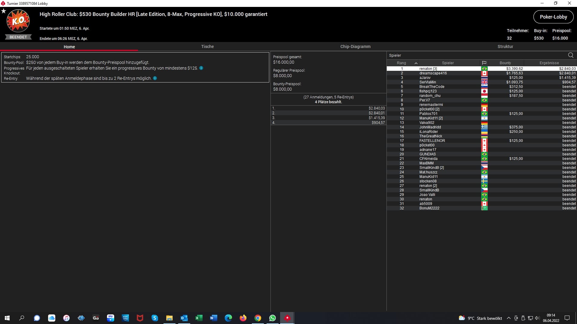 Dann gab es noch Siege für Jonah „RaiseUpBlind“ Silverstein (CAN – $3.553 + $5.375 Bounties) beim $1.050 Daily Cooldown und für „renaton“ (BRA – $2.840 + $3.390 Bounties) beim $530 Bounty Builder High Roller Late-Edition Event.
