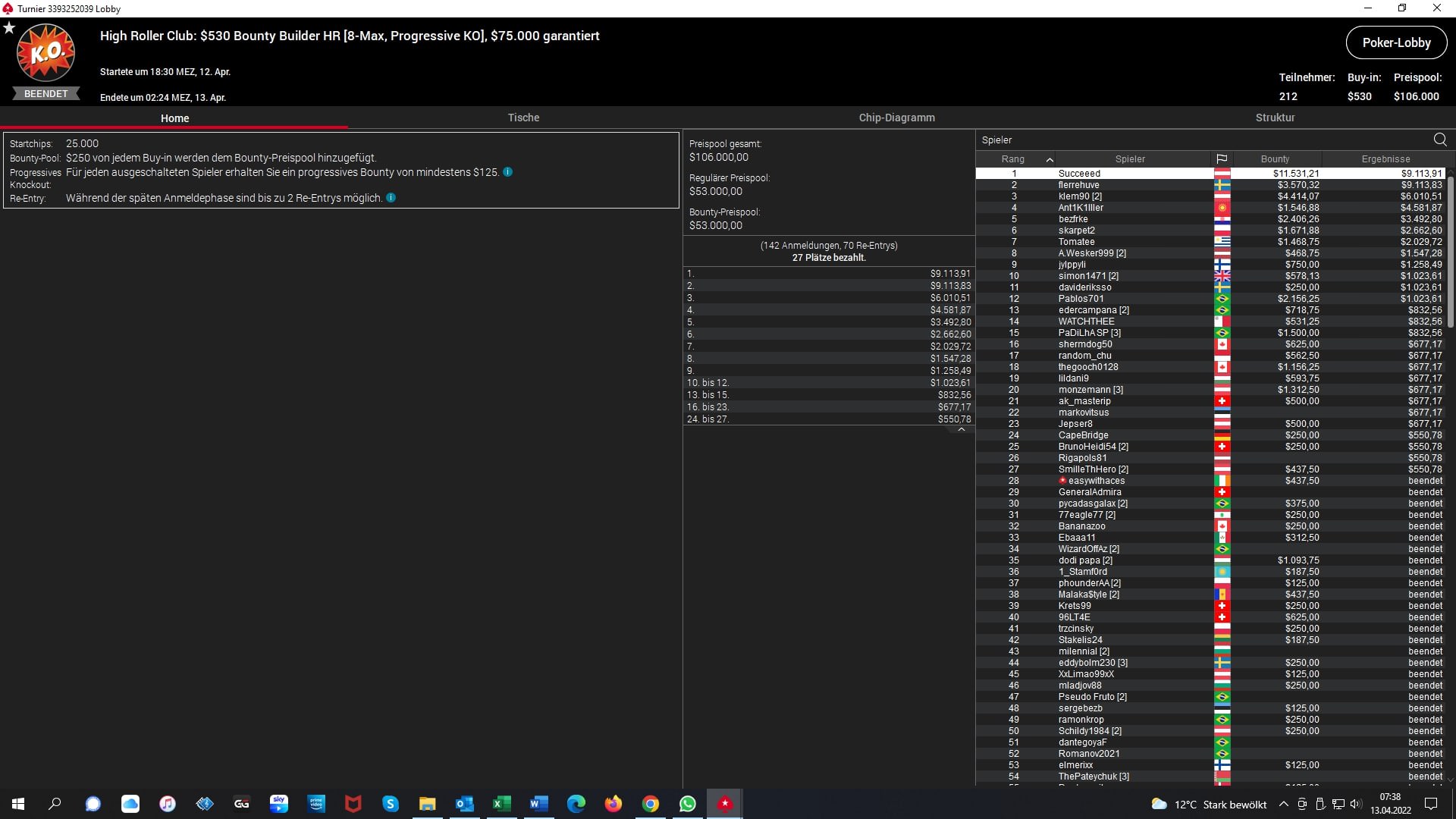 Beim größten Event des Tages, dem $530 Bounty Builder High Roller landeten gleich zwei deutschsprachige Online-Grinder auf dem Treppchen. 212 Entries hatten hier einen Preispool von $106.000 zusammen getragen. Platz 3 ging für $6.010 + $4.414 Bounties an „klem90“ aus Österreich. Im Heads-Up konnte sich dann Jacob „Succeeed“ Miegel (GER/AUT) gegen den Schweden „flerrehuve“ durchsetzen und das Turnier für $9.113 + $11.531 Bounties gewinnen.