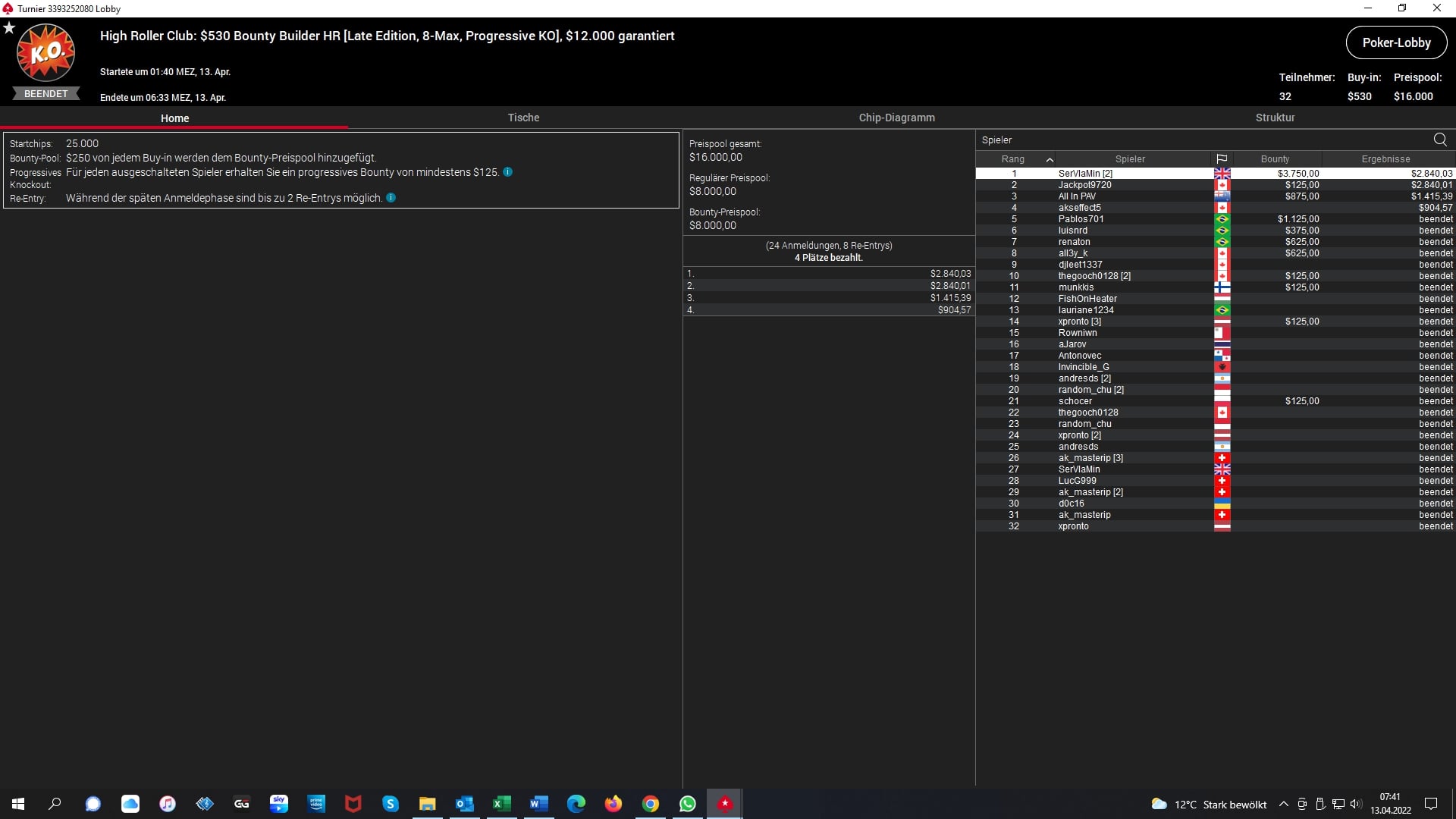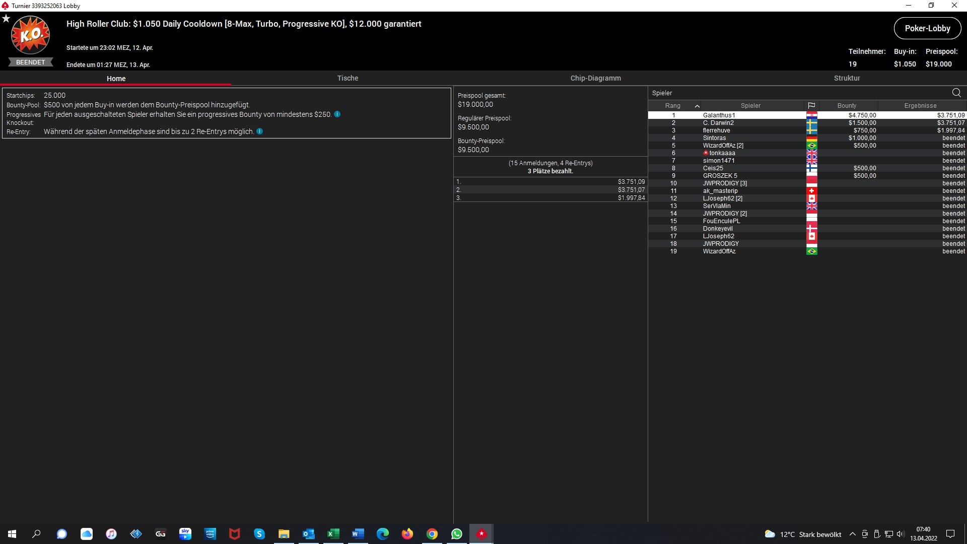Dann gab es noch Siege für „Galanthus“ (CRO – $3.751 + $4.750 Bounties) beim $1.050 Daily Cooldown und für „SerVlaMin“ (GBR – $2.840 + $3.750 Bounties) beim $530 Bounty Builder High Roller Late-Edition Event.