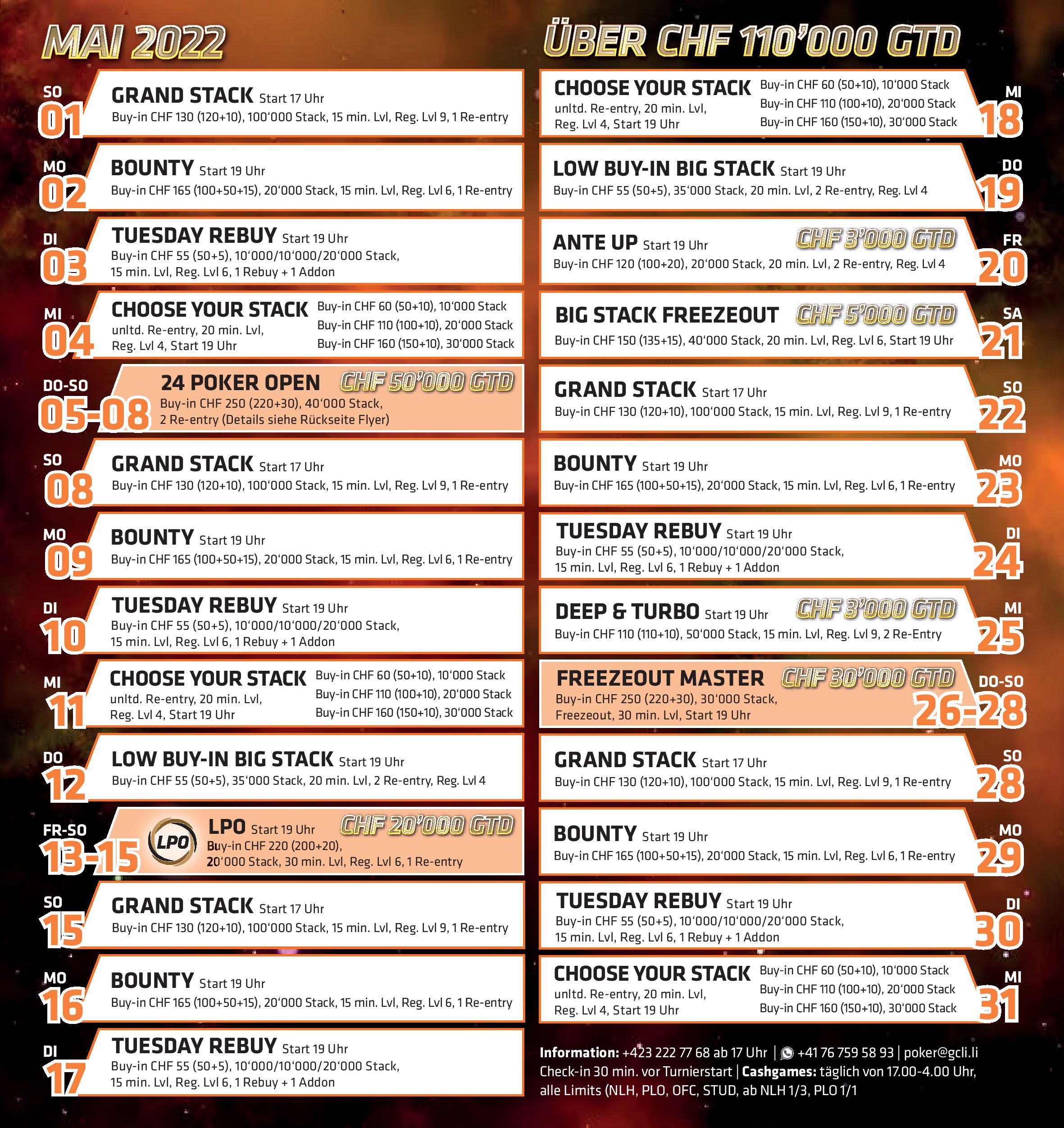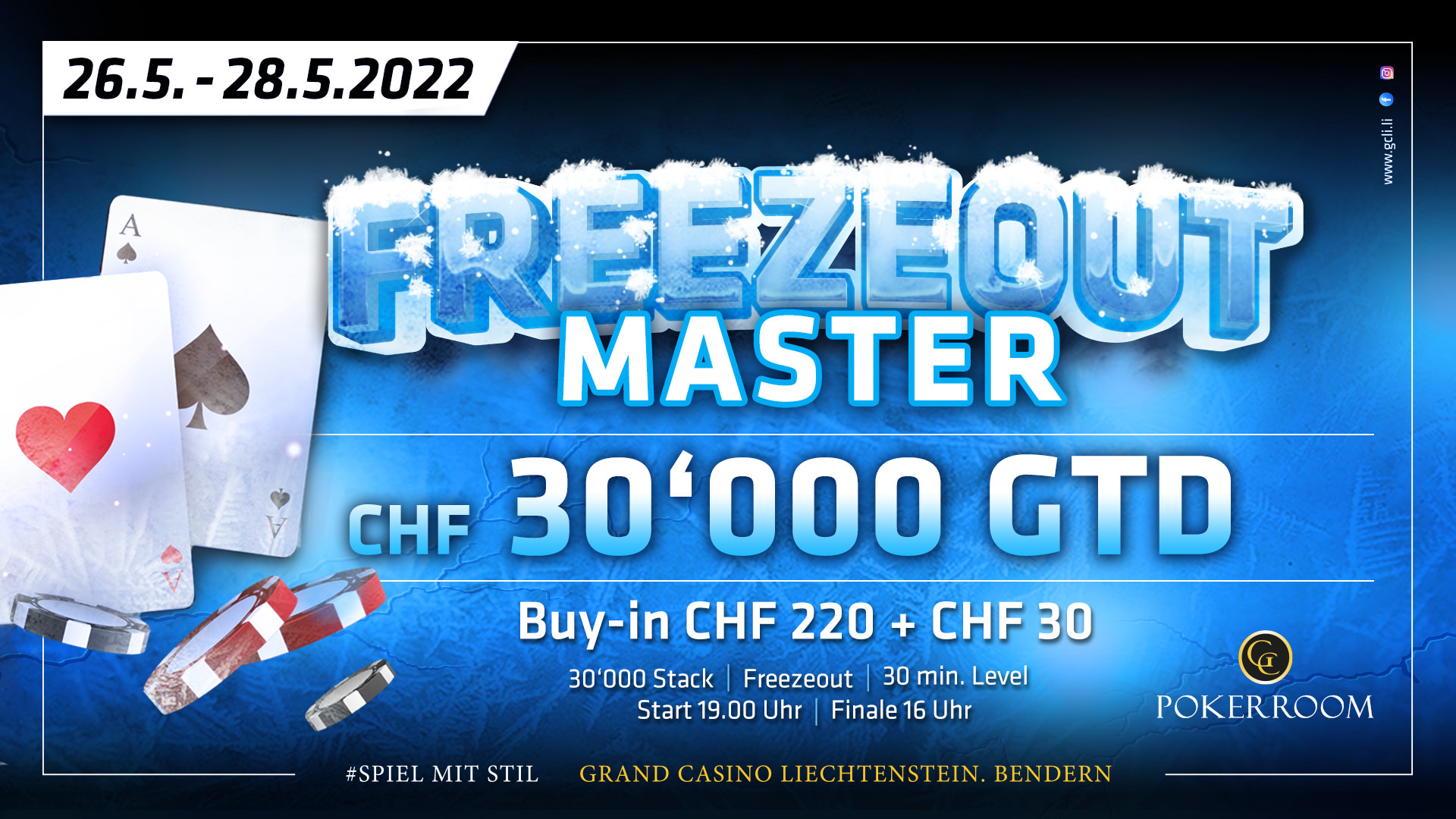 Am Donnerstag geht es im GC Pokerroom um um 19:00 Uhr mit dem CHF 50+5 Low Buy-In Big Stack Event weiter. Hier startet man mit 35.000 in Chips und jeder Level dauert 20 Minuten. Zwei Re-Entries sind möglich und die Late-Registration ist für vier Levels geöffnet.