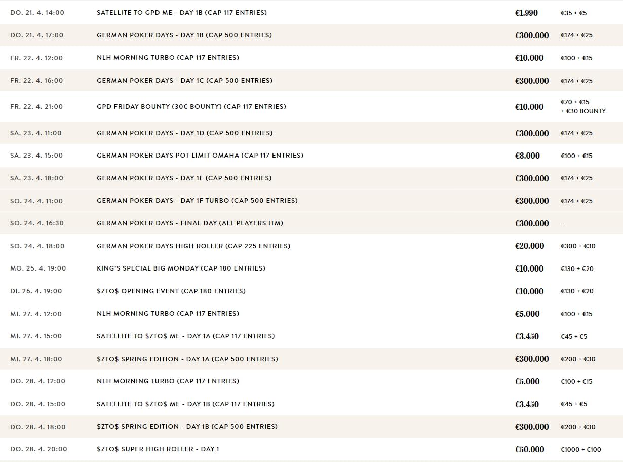 Heute steht im King’s Resort ab 16:30 Uhr natürlich der finale zweite Spieltag beim €174+25 GPD Main Event im Fokus. Wer dort dann aber nicht mehr dabei ist, kann ab 18 Uhr das €300+30 GPD High Roller spielen, der garantierte Preispool beträgt immerhin €20.000.