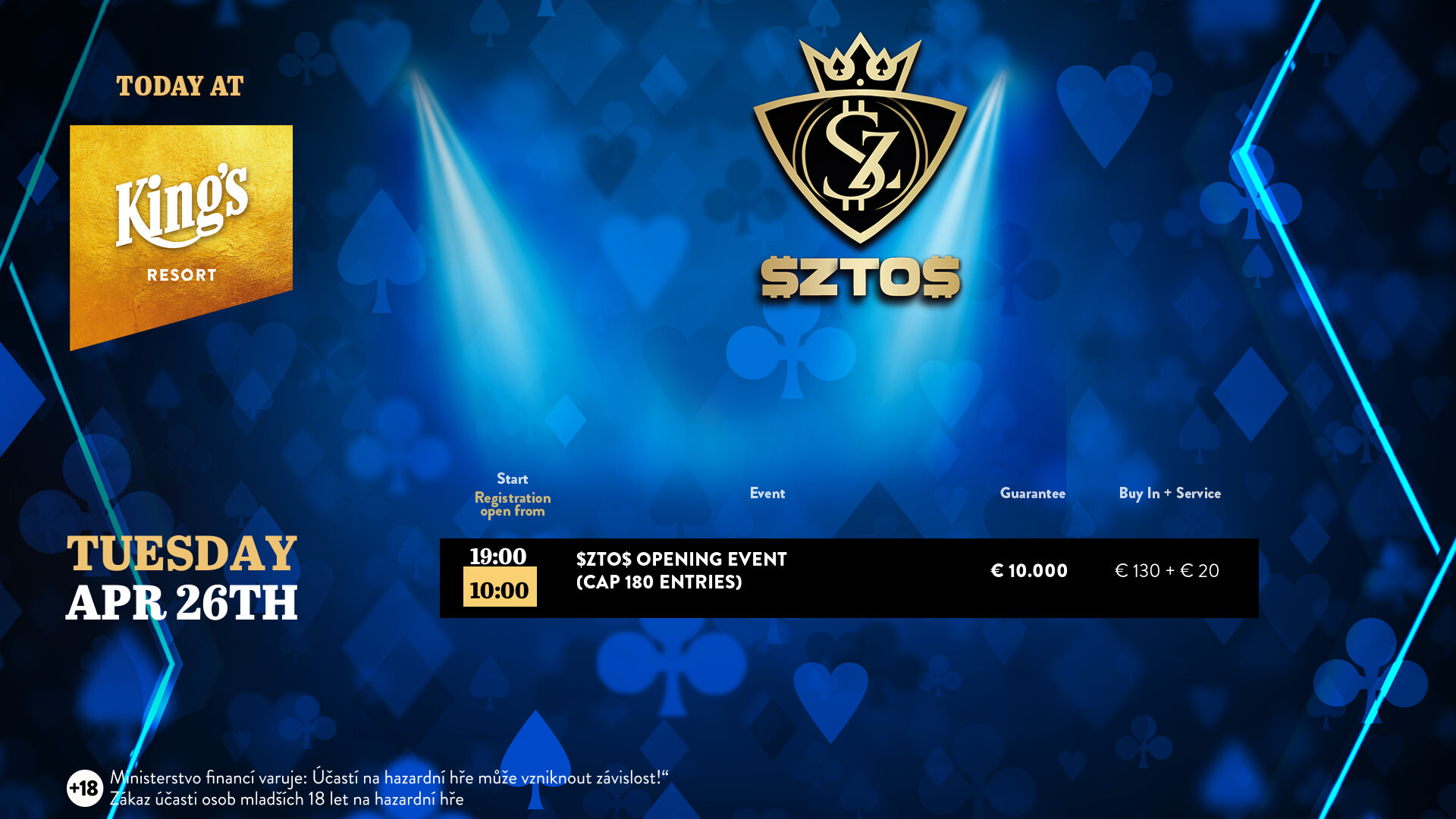 Heute beginnt, wie bereits angesprochen, das $ZTO$ im Kings. Den Auftakt macht das €130+20 $ZTO$ Opening mit €10.000 garantiert. Am Mittwoch beginnt dann der mit Spannung erwartete €200+30 Main Event mit €300.000 garantiert. Weitere Infos findet ihr HIER.