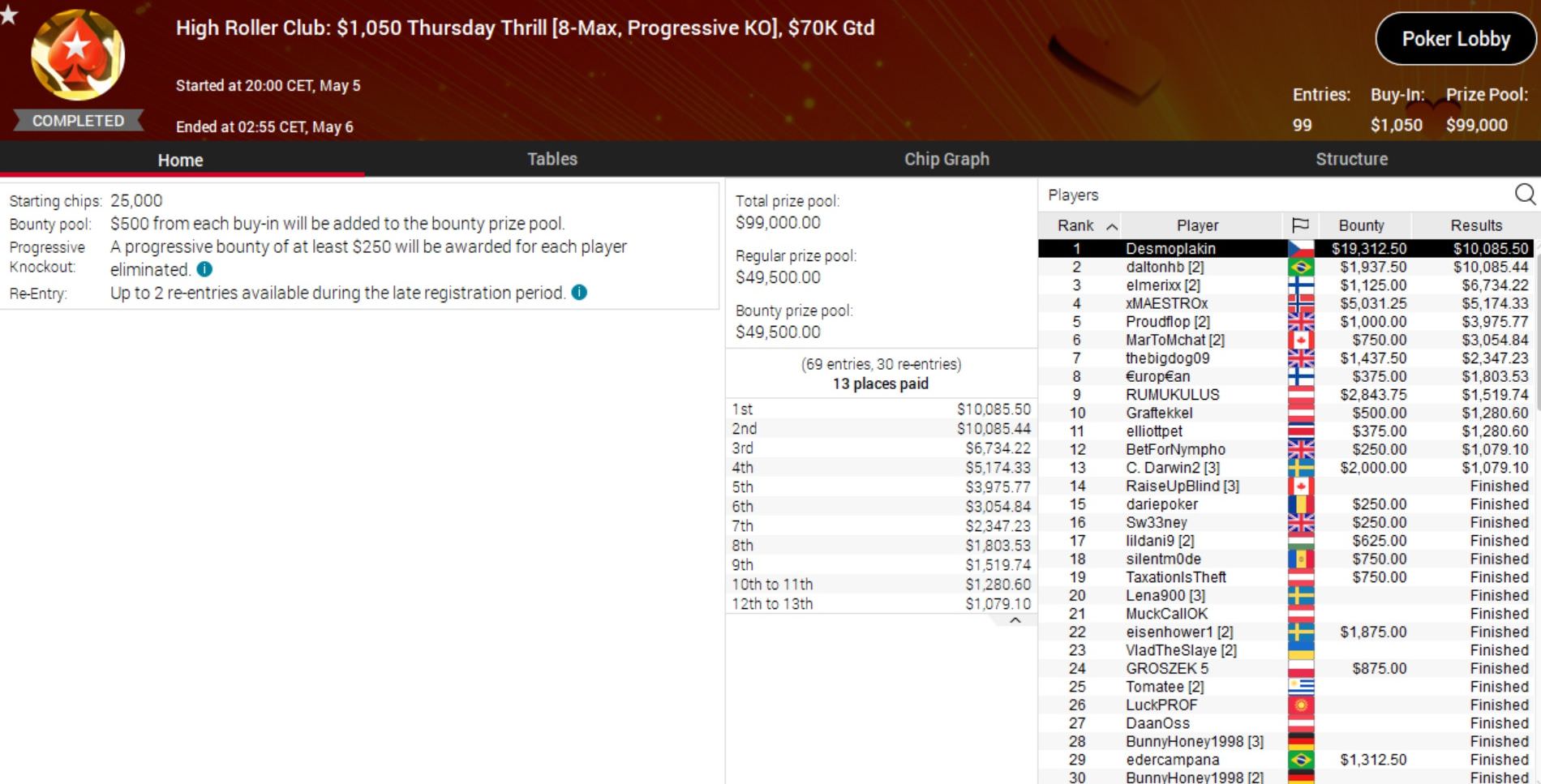 Beim $1.050 Thursday Thrill, an dem sich 99 Entrys beteiligten, sah es für Leon „RUMUKULUS“ Sturm lange sehr gut aus, doch am Ende reichte es „nur“ für Platz 9 und ein kombiniertes Preisgeld von gut $4.300.