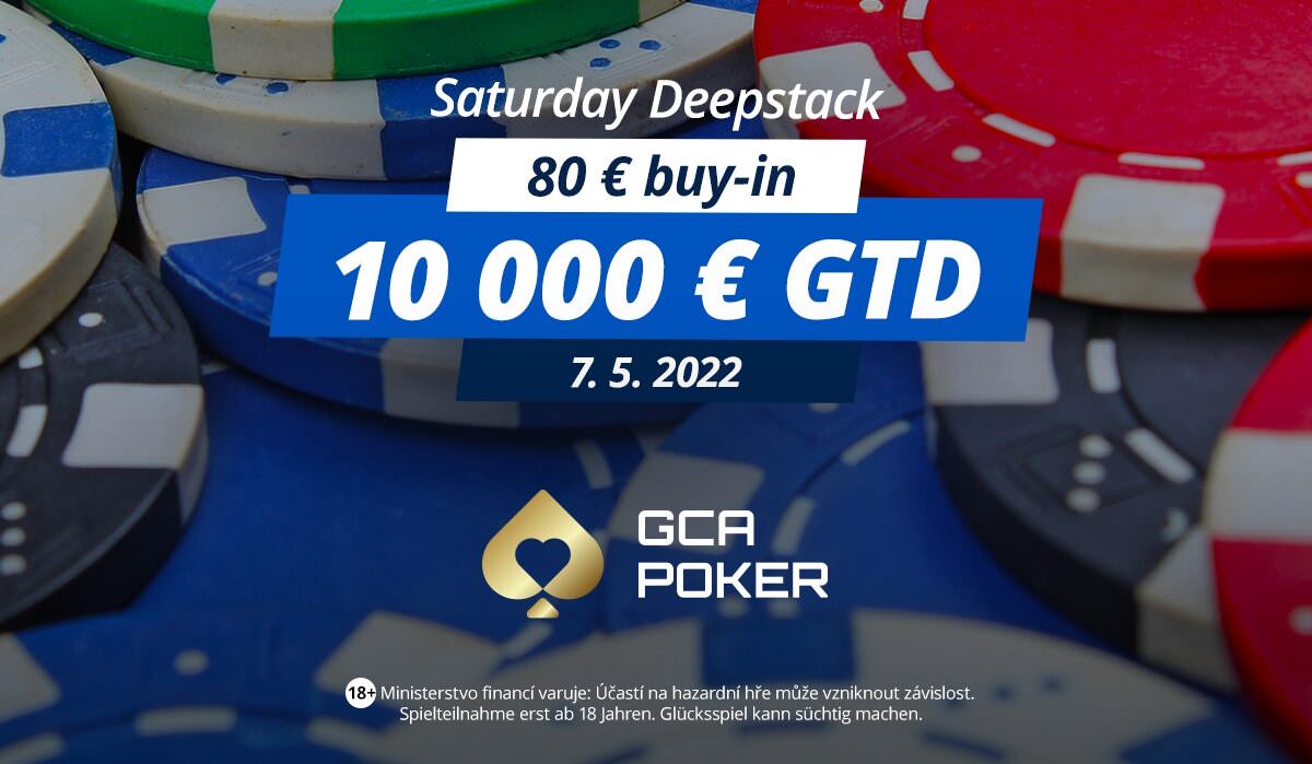 Am Samstag geht es im GCA Pokerroom um 18:00 Uhr mit dem €70+€10 Saturday Deepstack Event weiter, bei dem €10.000 garantiert werden. Die Startdotation beträgt 40.000 und die Blinds werden alle 20 Minuten erhöht. Zwei Re-Entries sind möglich und die Late-Registration ist bis 21:15 Uhr geöffnet.