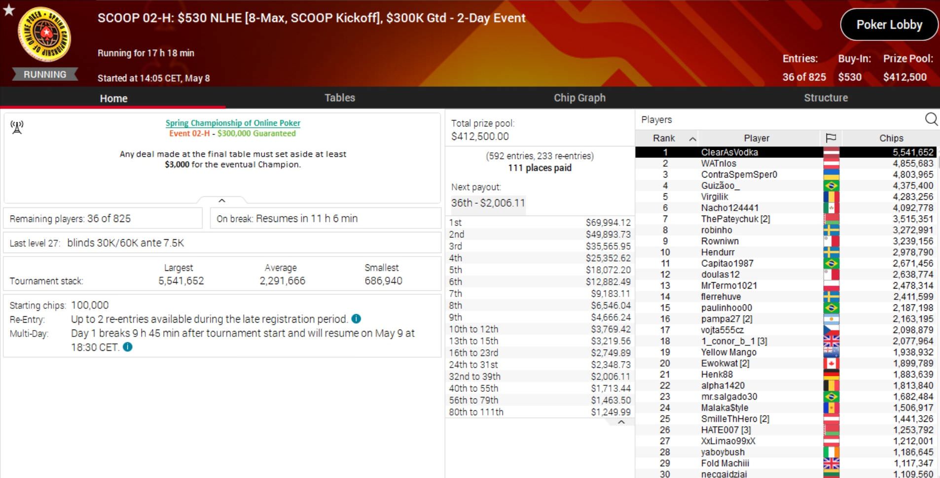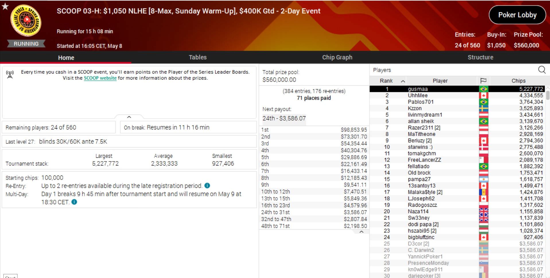 | 28. Mai | Sat | 16:30 | SCOOP 92-M: $22 NLHE [7-Max,][Hyper-Turbo,][PKO,][Last][Player][Standing], $100K Gtd |