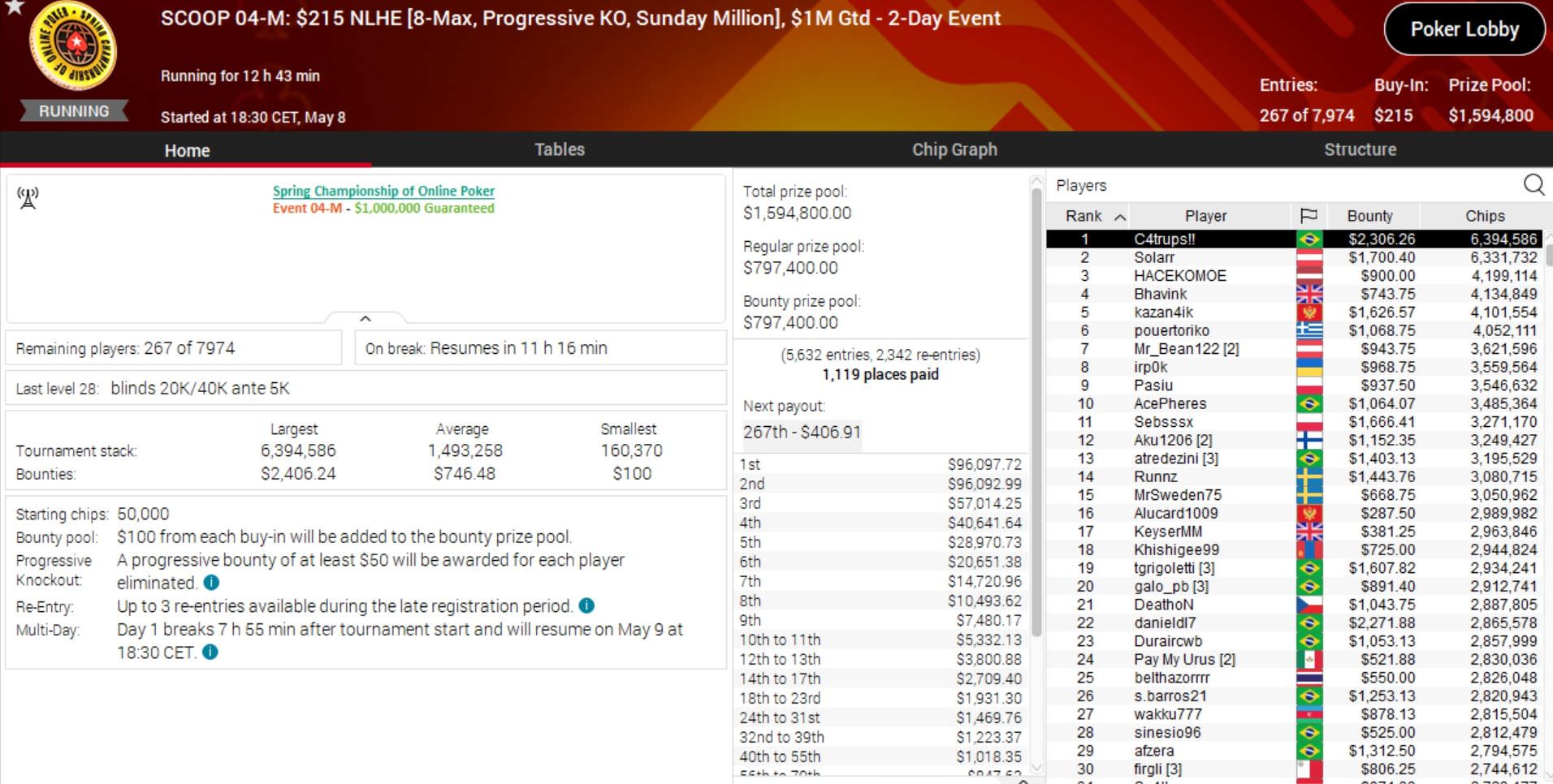 | 28. Mai | Sat | 16:30 | SCOOP 92-L: $2.20 NLHE [7-Max,][Hyper-Turbo,][PKO,][Last][Player][Standing], $20K Gtd |