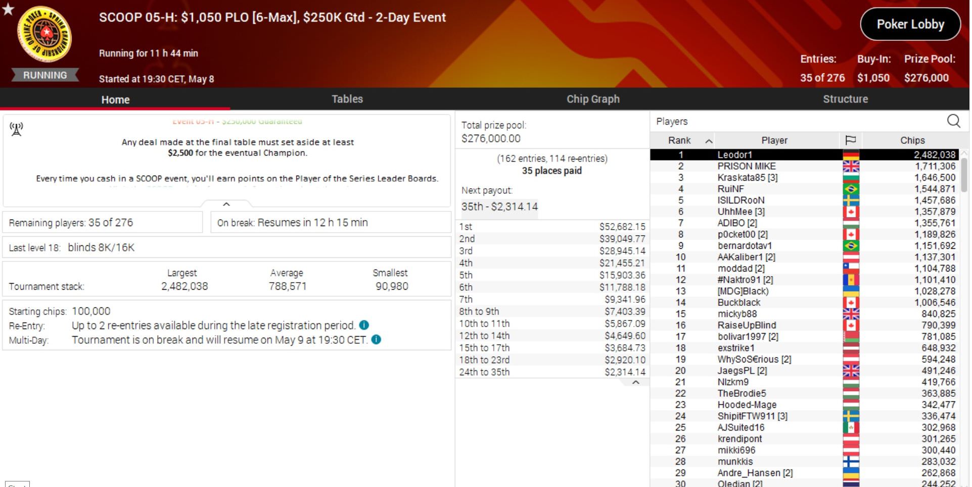 Besonders gute Chancen hat „Leodor1“ bei Event 5-H, dem $1.050 PLO. Er führt die 35 Finalisten an, die alle schon im Preisgeld sind.