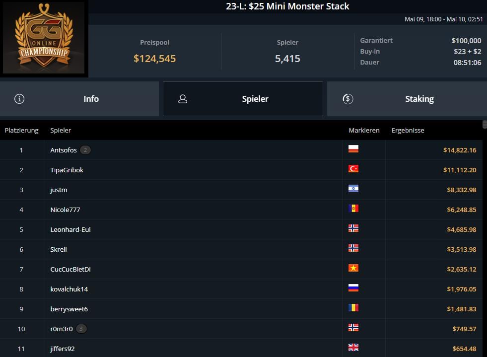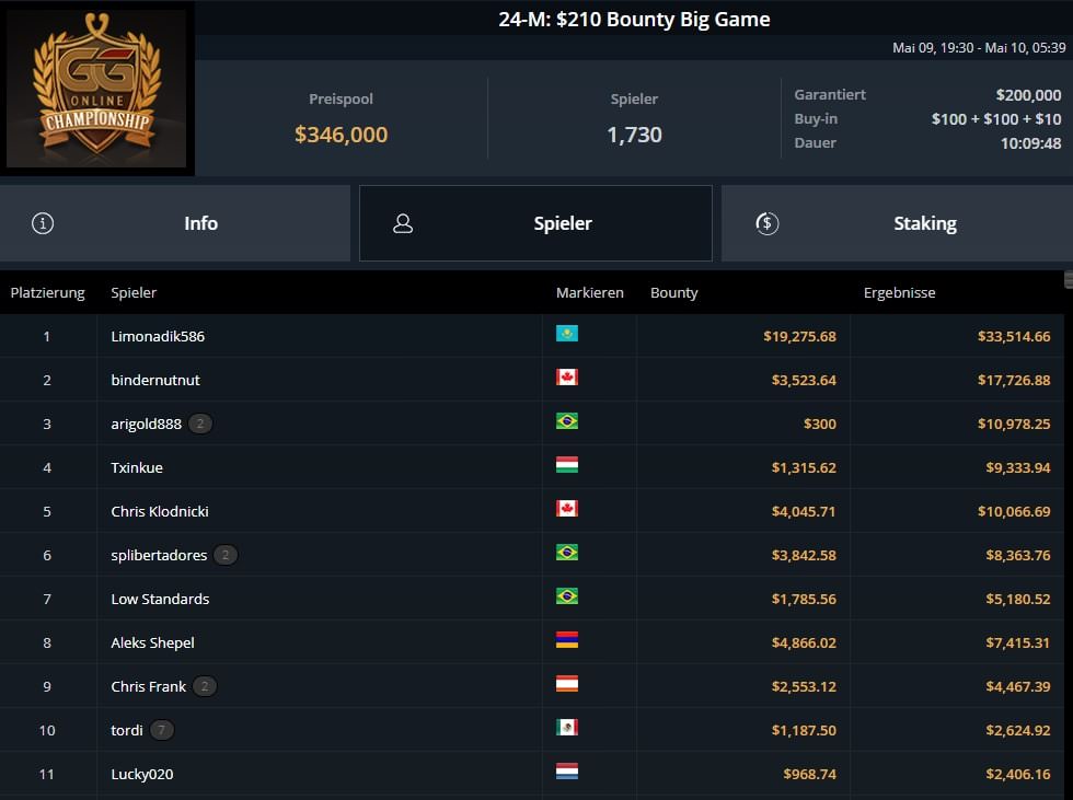| 2022-05-30 | Mon | 19:00 | 125-M: $525 GGOC Turbo Main Event | $525 | $400.000 |