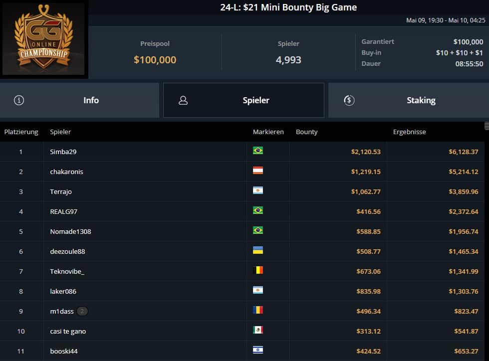 Beim $21 Mini Bounty Big Game Event #24-L wurde „chakaronis“ Zweiter und kassierte $5.214 inkl. $1.219 Bounties.