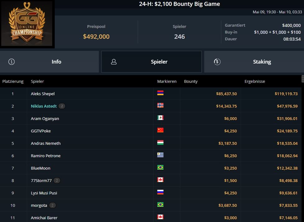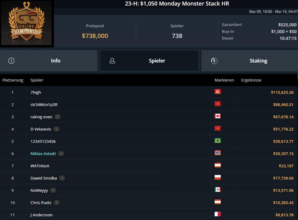 | 2022-05-29 | Sun | 17:00 | 116-M: $1.050 GGMasters Freezeout Championship [2-Day][Event] | $1.050 | $1.000.000 |