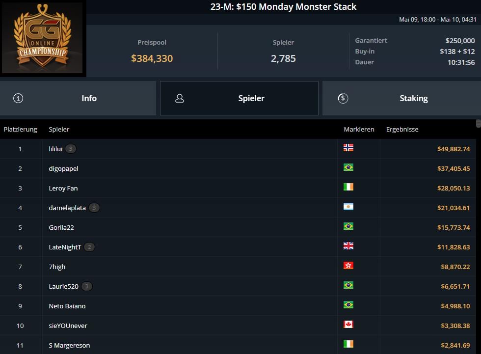 | 2022-05-30 | Mon | 18:00 | 124-M: $150 Monday Monster Stack | $150 | $250.000 |