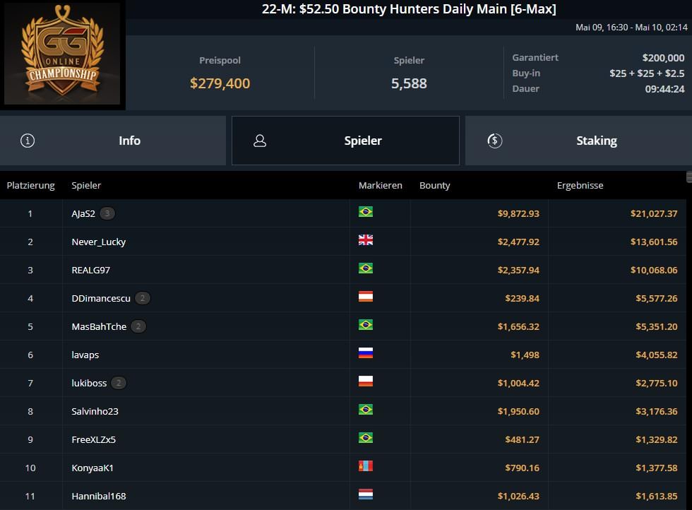 | 2022-05-30 | Mon | 16:30 | 123-M: $52.50 Bounty Hunters Daily Main [6-Max] | $52.50 | $250.000 |