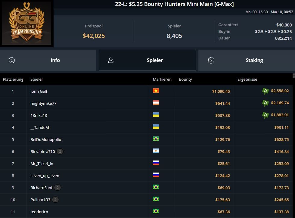 Das $5,25 Bounty Hunters Mini Main 6-Max Event #22-L wurde durch einen 3-Way Deal entschieden. Hier wurde der Österreicher „mightymike77“ Runner-Up für $2.169 inkl. $641 Bounties.