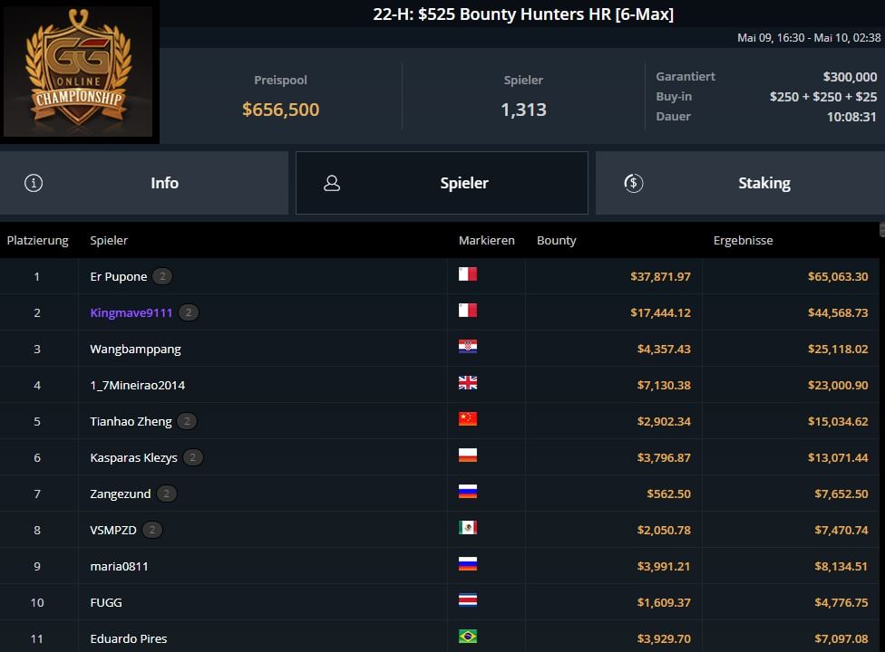 | 2022-05-29 | Sun | 16:30 | 115-M: $525 Bounty Hunters HR Main Event | $525 | $1.250.000 |