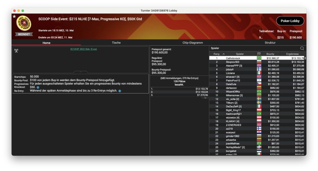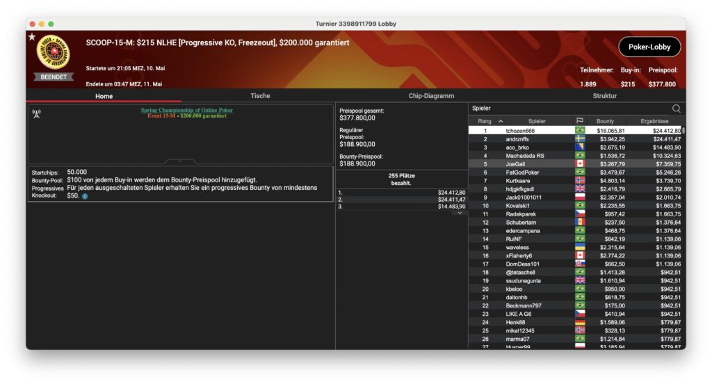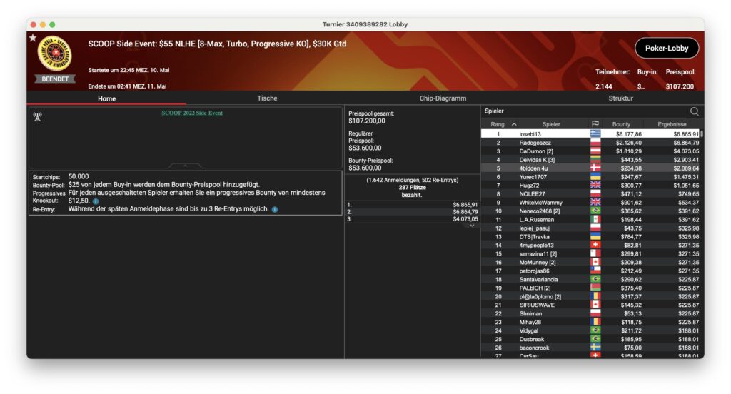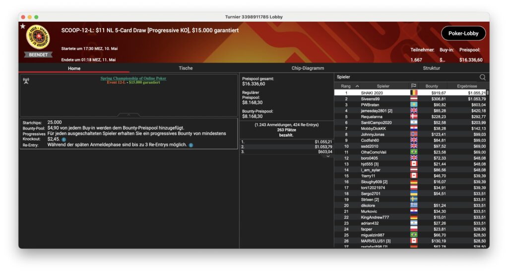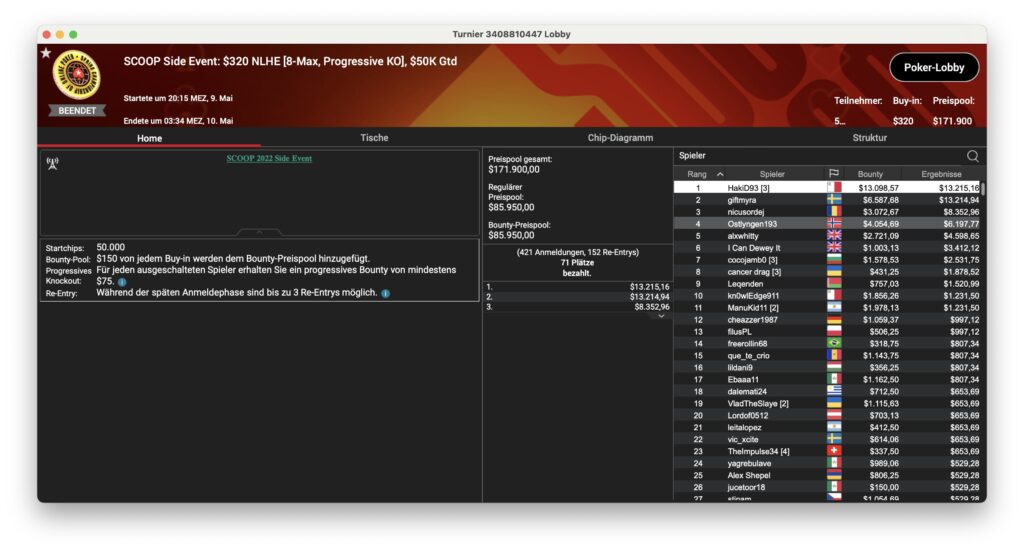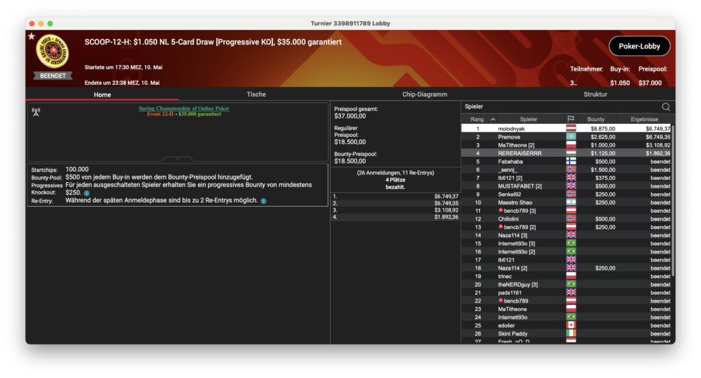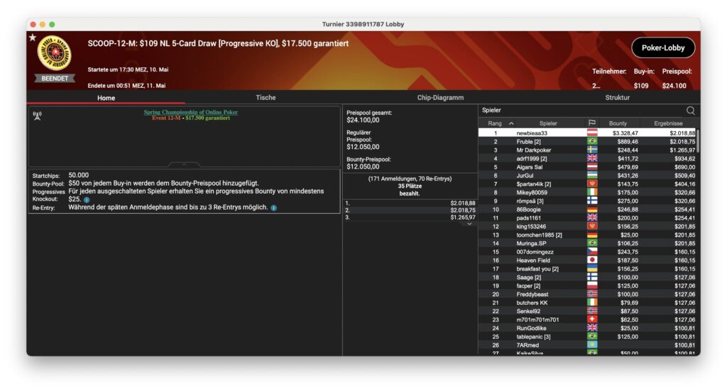 „newbieaa33“ aus Österreich konnte sich beim $109 NL 5-Card Draw PKO (12-M) durchsetzen. Er ließ 240 Gegner hinter sich und gewann $3.328 + $2.018. „F.mca777“ wurde beim SCOOP-11-H, $215 NLHE, Fünfter für $11.701.