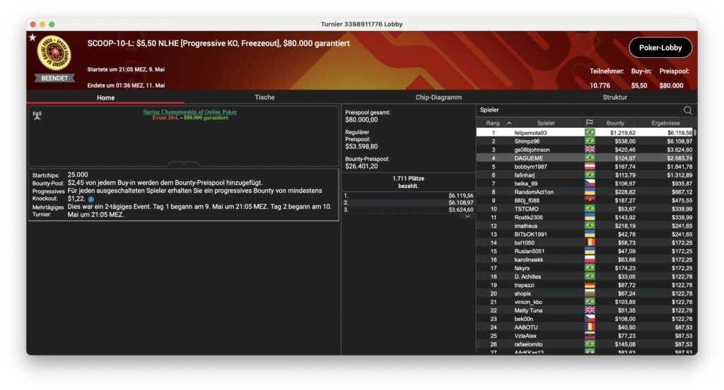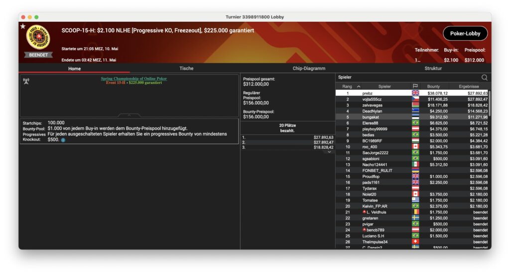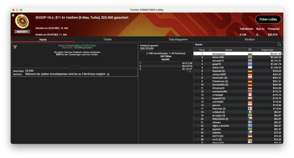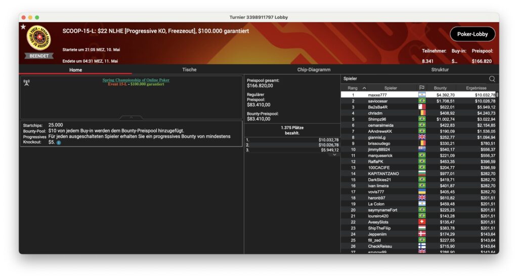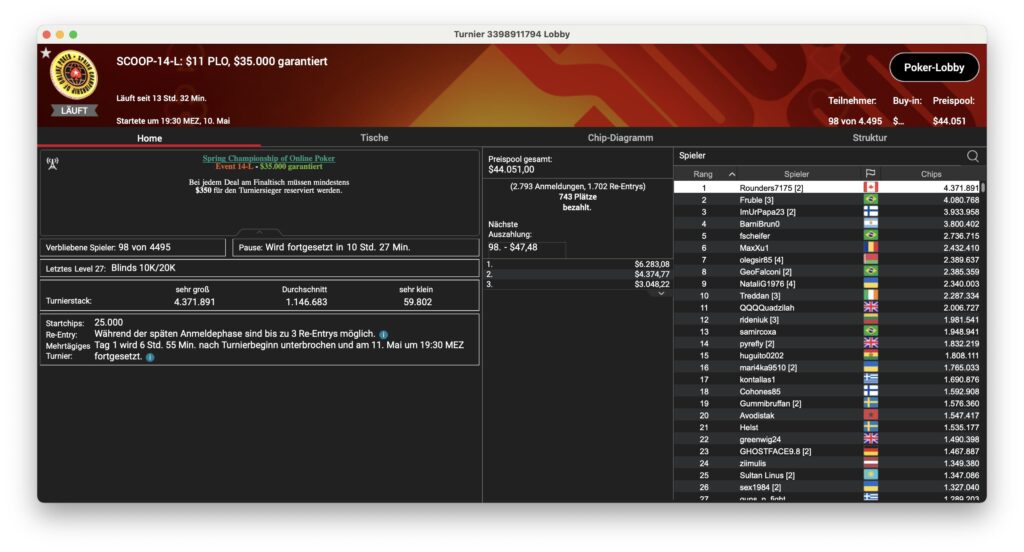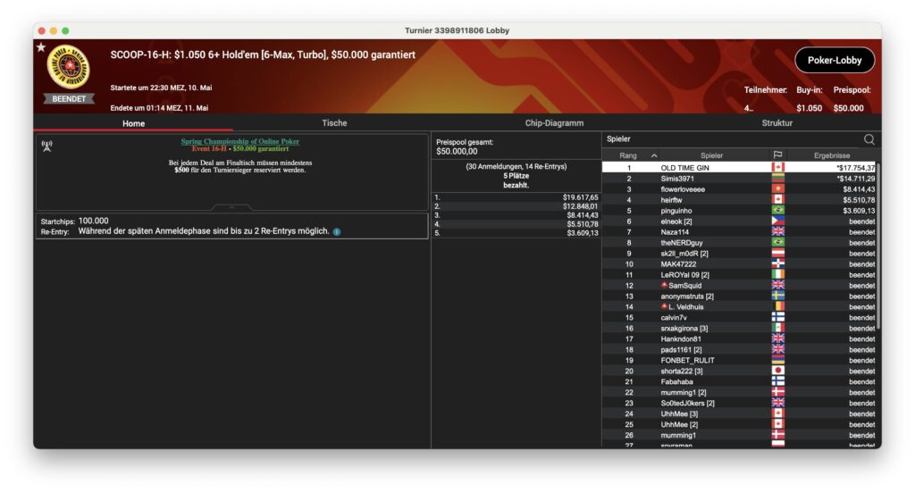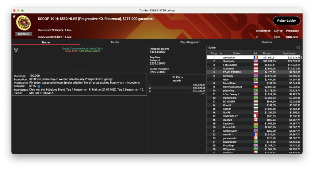 „newbieaa33“ aus Österreich konnte sich beim $109 NL 5-Card Draw PKO (12-M) durchsetzen. Er ließ 240 Gegner hinter sich und gewann $3.328 + $2.018. „F.mca777“ wurde beim SCOOP-11-H, $215 NLHE, Fünfter für $11.701.