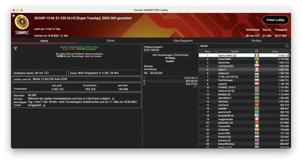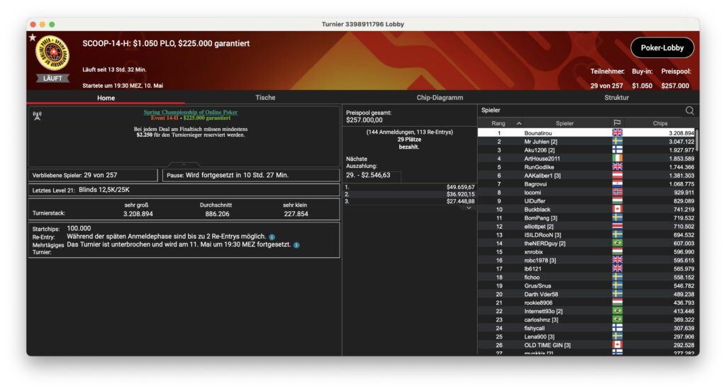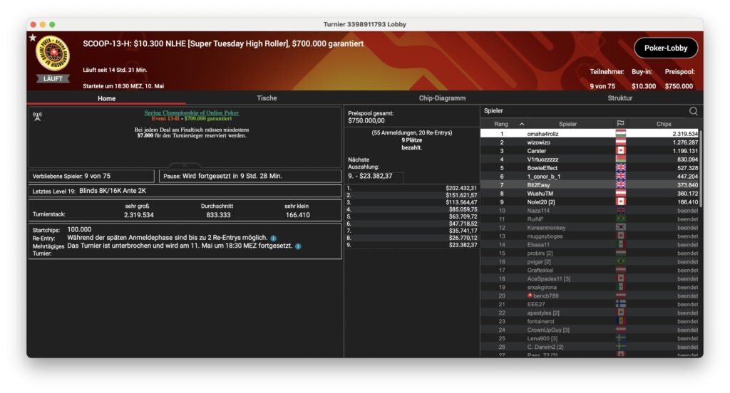 Beim $1.050 PLO (14-H) ist Dominik „Bounatirou“ Nitsche führend. Er hat als Erster von 29 verbleibenden Spielern 3,2 Mio. Chips. Für den ersten Platz gibt es $49.659. Neun von 75 Spielern sind beim $10.300 NLHE (13-H) noch im Rennen. Ole „wizowizo“ Schemion ist als Zweiter noch mit dabei. Er hat 1,28 Mio Chips. Führend ist Laszlo „omaha4rollz“ Bujtas mit 2,32 Mio. Chips. Beide hoffen auf den $202.432 schweren Sieg.