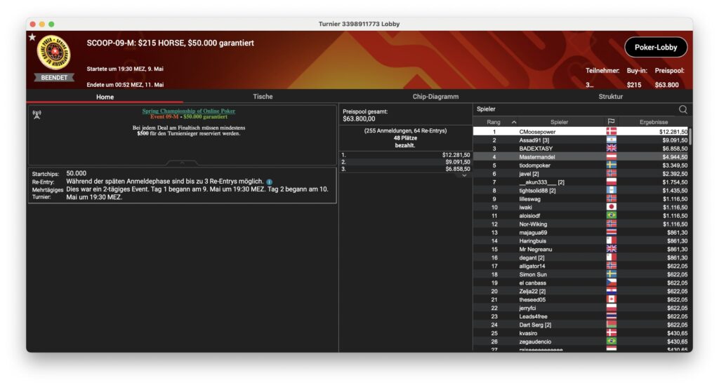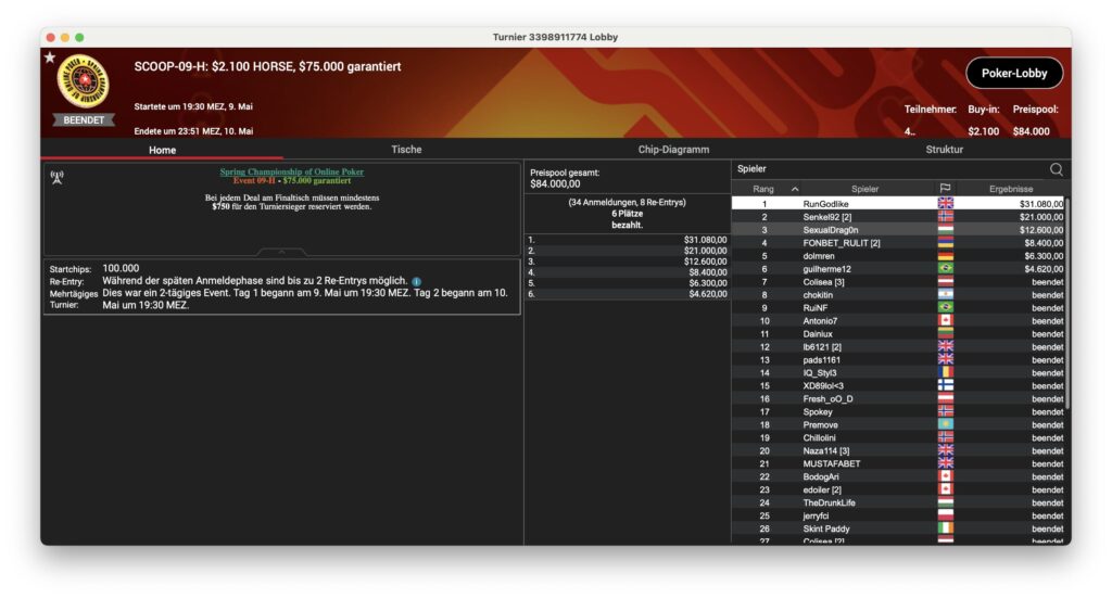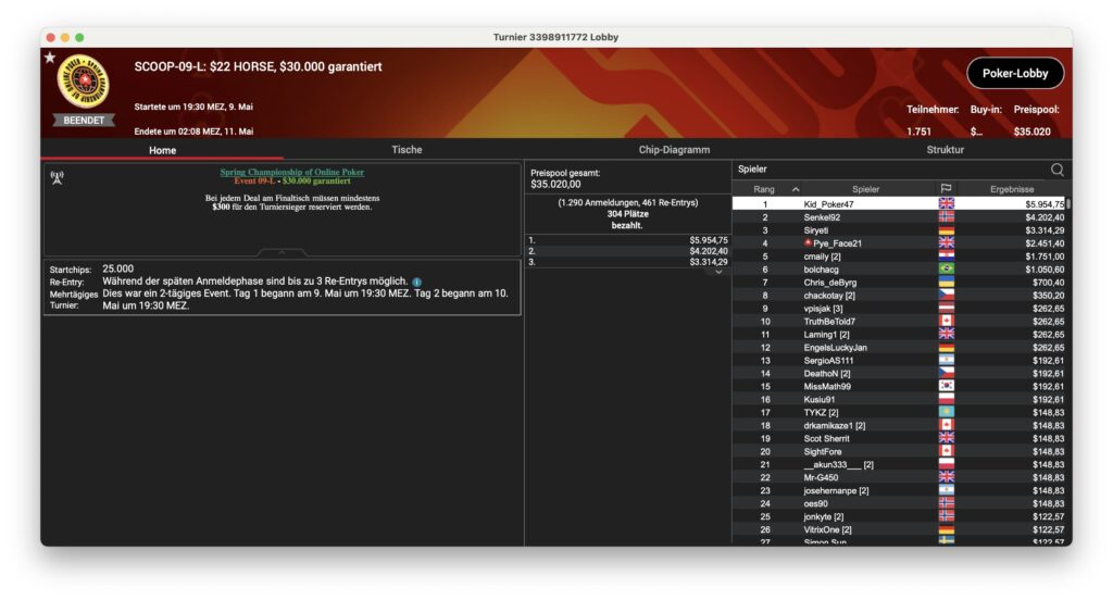 Beim 09-L $22 HORSE wurde der Deutsche „Siryeti“ Dritter für $3.314, der Sieg ging an „Kid_Poker47_ für $5.954. Brite Benny „RunGodlike“ Glaser schnappte sich das 09-H $2.100 HORSE mit 42 Runnern für $31.080.