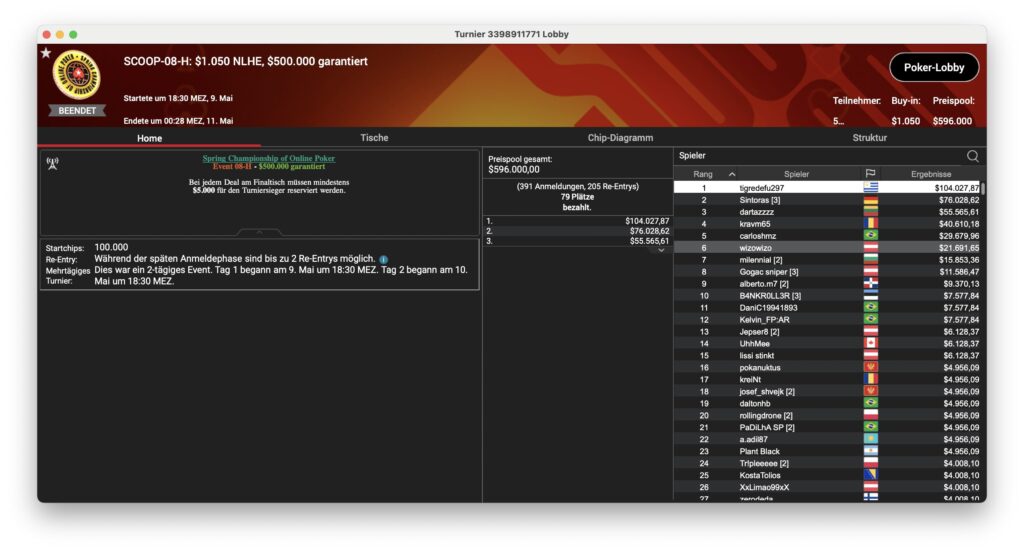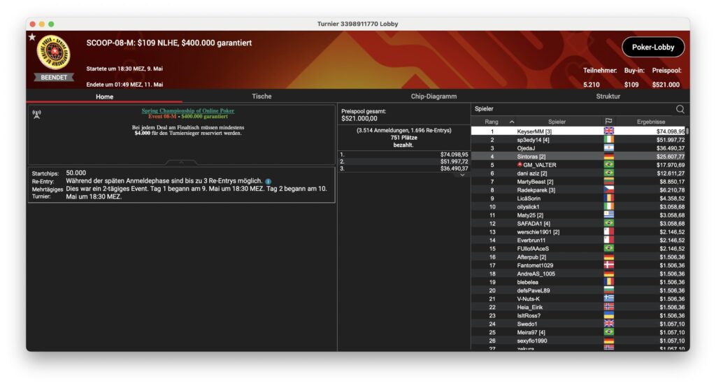 „Sintoras“ schaffte es bei Event 08-H, dem $1.050 NLHE, bis ins Heads-Up, war dort aber dem Griechen „tigredefu297“ unterlegen. Für den deutschen Spieler gab es dort als Runner-Up $76.028. Zusätzlich konnte er bei Event 08-M, dem $109 NLHE, als Vierter nochmal stolze $25.607 mitnehmen.